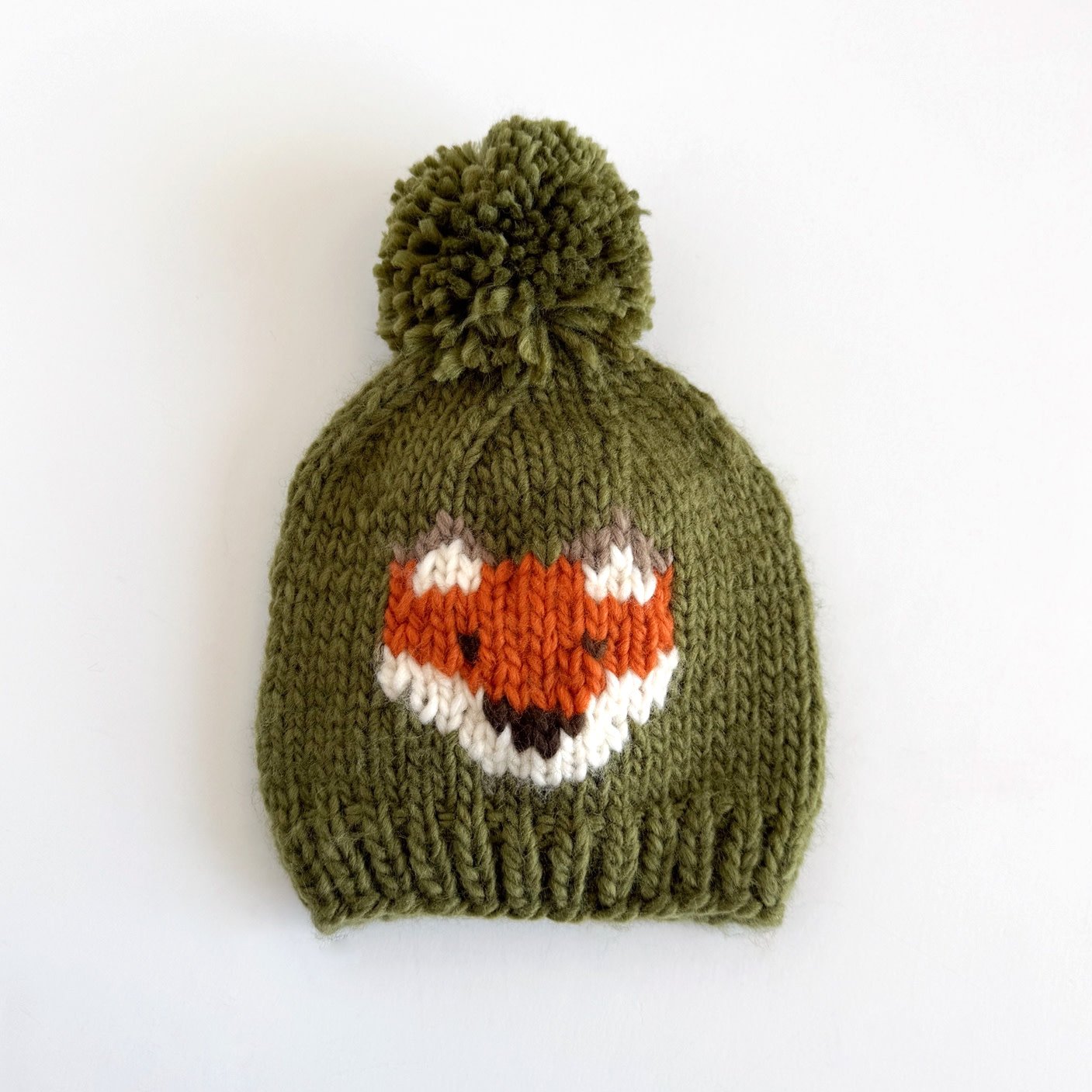 This adorable hand-knit baby beanie from Figgy Friends features a sweet fox motif that adds playful charm to any little outfit. Crafted with soft, cozy yarn and finished with a fluffy pom-pom on top, it keeps tiny heads warm while bringing a touch of woodland whimsy. The earthy green base paired with the fox’s cheerful face makes it both charming and timeless.