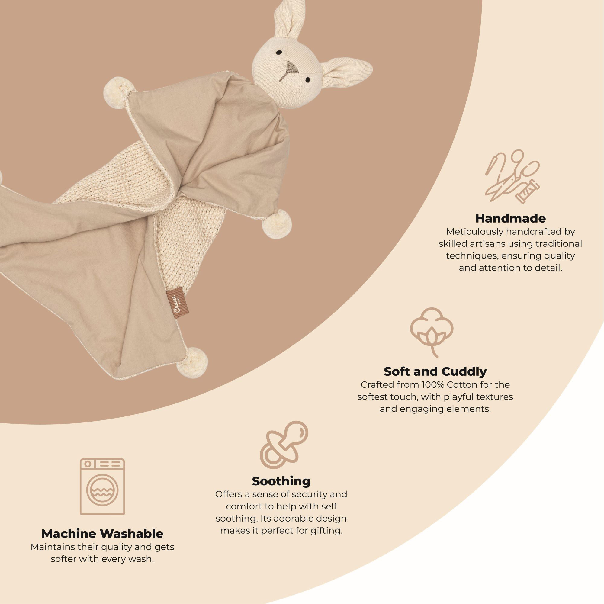 Avery Ollie the Bunny from Crane Baby is a sweet and soothing organic cotton baby blanket designed to comfort and calm from the very first cuddle. Featuring an adorable bunny character with soft ears and a gentle embroidered face, this security-style blanket is perfect for little hands to hold, snuggle, and explore. Crafted from organic cotton with a beautiful mix of smooth fabric and cozy knit texture, the blanket offers both softness and sensory comfort. Finished with delicate pom-pom corners and neutral tones, it’s ideal for nap time, stroller rides, or bedtime routines. Thoughtfully made and irresistibly cuddly, Avery Ollie the Bunny makes a cherished companion and a lovely gift for newborns and babies.