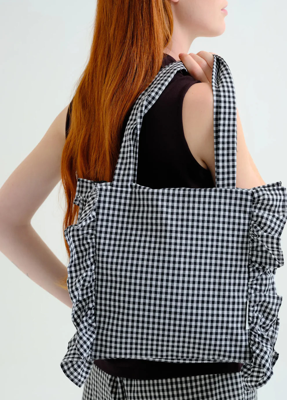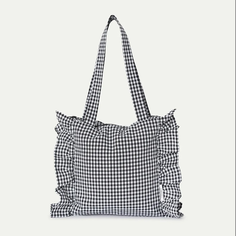 Charming and effortlessly stylish, this black gingham tote bag from Compania Fantastica adds a playful twist to your everyday essentials. Crafted from cotton, it features a classic check pattern that never goes out of style, while soft ruffle detailing along the sides brings a feminine, eye-catching touch. Designed with practicality in mind, the spacious interior is fully lined to keep your belongings secure and organized. The top zip closure ensures everything stays in place, making it perfect for daily use, shopping trips, or casual outings. Double long handles allow for comfortable shoulder carry, combining function with timeless design.