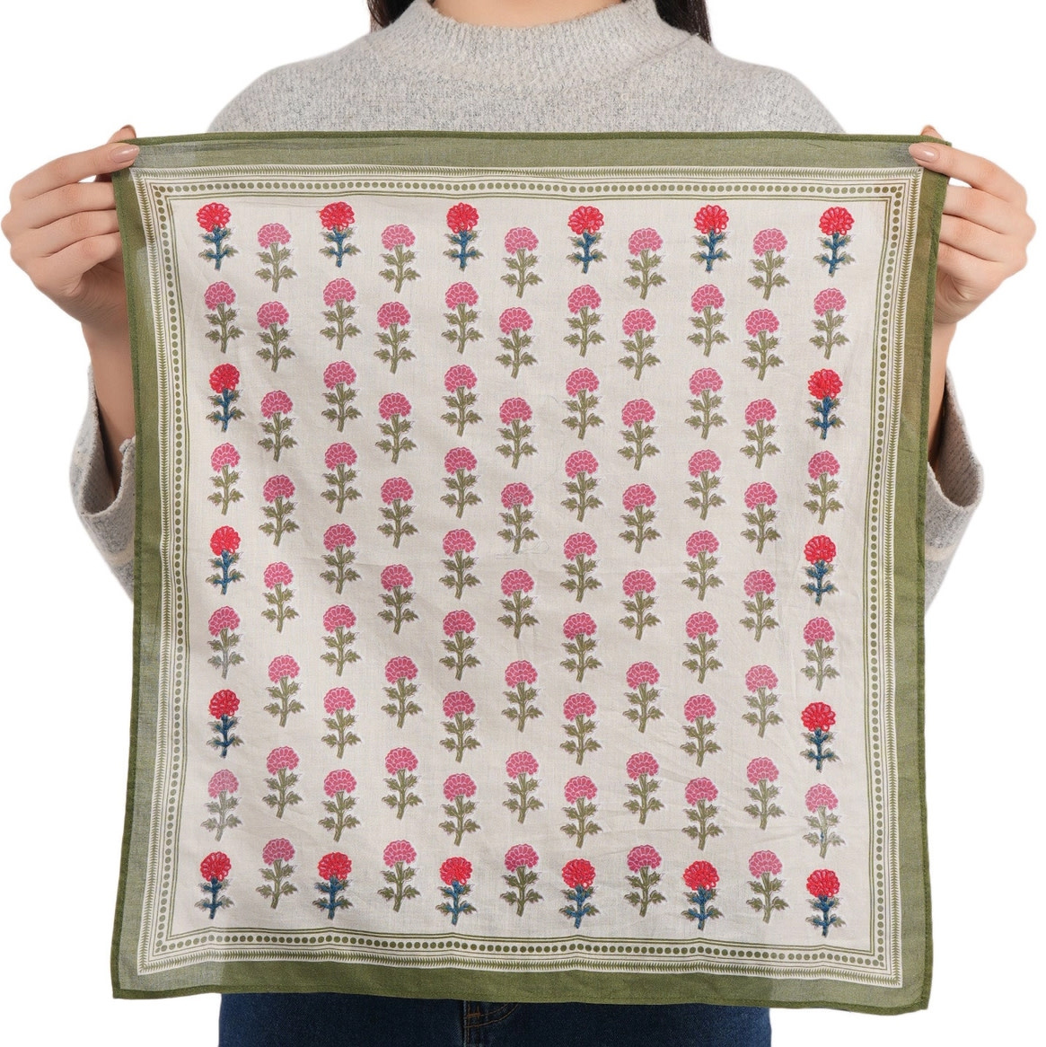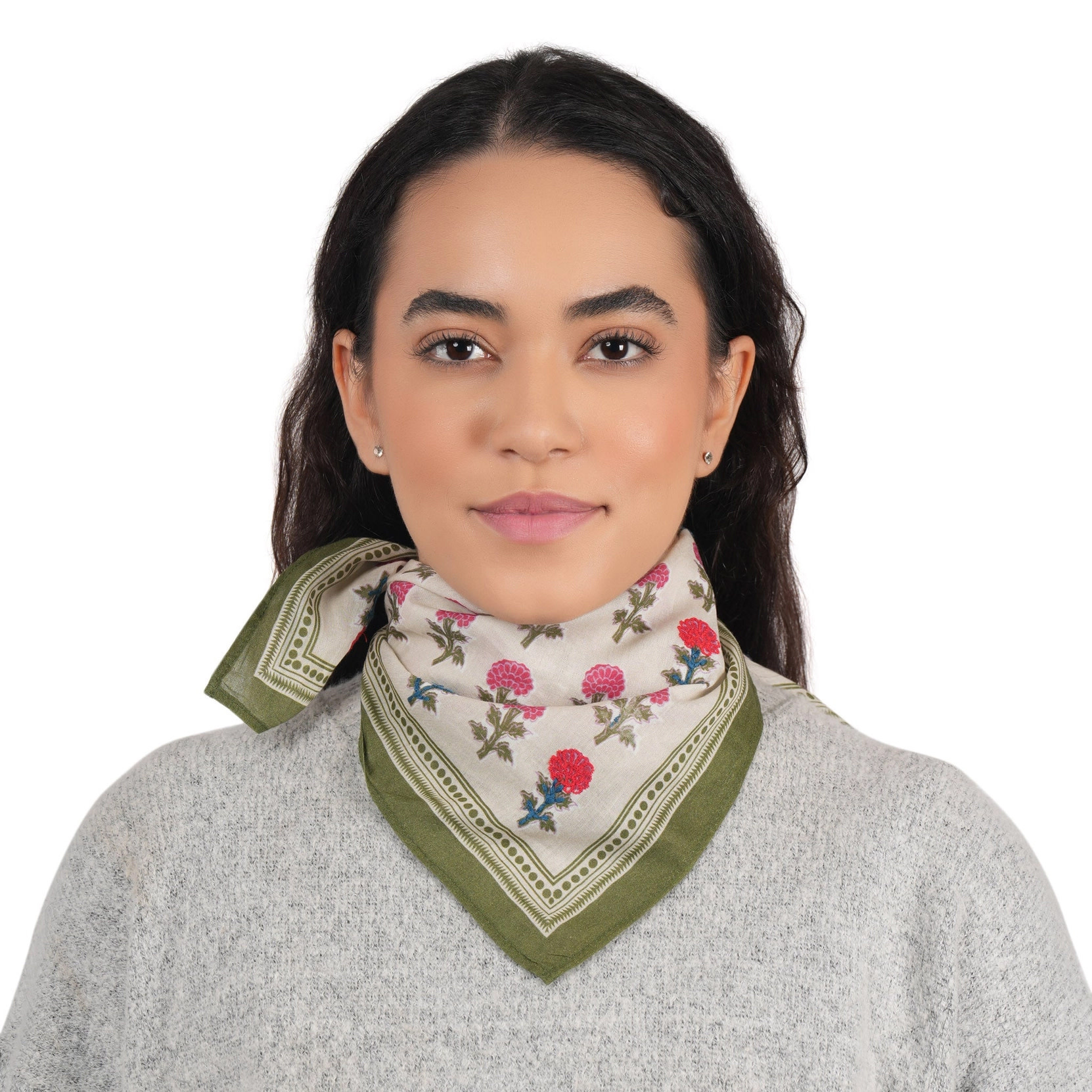 Embrace timeless elegance with the Heritage Bloom Embroidered Bandana in Cream, a versatile accessory that blends classic style with artisanal detailing. This lightweight bandana features an all-over print of stylized blossoms in a calming palette of red and green, set against a cream background for understated sophistication. The floral motifs are enhanced with delicate hand-guided machine embroidery, adding subtle texture and three-dimensional depth. A refined, simple border frames the design, giving the bandana a polished, finished look that elevates any outfit. Perfect for year-round wear, this bandana can be styled in multiple ways—tie it as a chic neck scarf, a retro-inspired headscarf, or attach it to a handbag for a sophisticated accent. Its soothing color palette and intricate detailing make it ideal for adding warmth, personality, and elegance to both casual and polished ensembles.