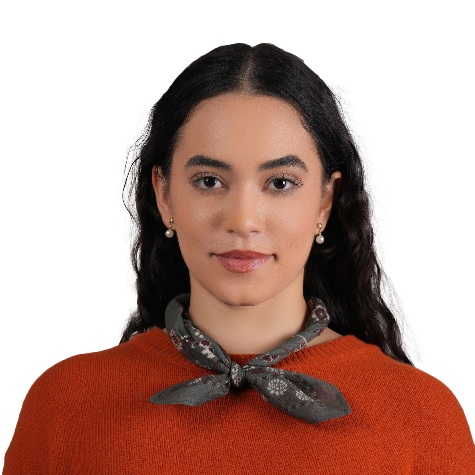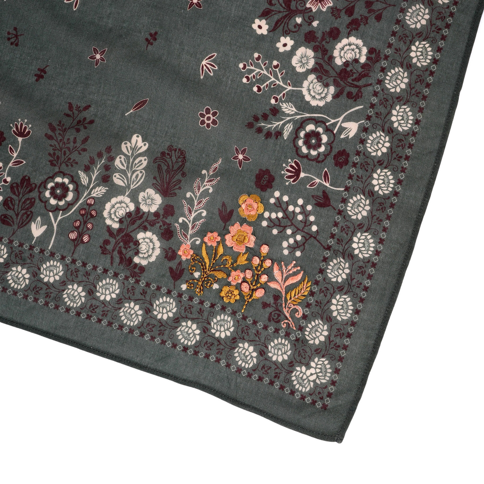 Earthy and effortlessly cool, the Embroidered Rodeo Lassie Bandana in Dusty Olive from Vismaya brings a refined western-inspired charm to your everyday styling. Crafted from soft, lightweight cotton, this square bandana offers a smooth feel and an easy, relaxed drape. The muted dusty olive base is beautifully contrasted with delicate floral and vine motifs in warm burgundy, soft ivory, and subtle blush tones. Intricate embroidered accents near the border add texture and artisanal detail, while the patterned trim frames the design with a touch of vintage character. Perfect for tying around the neck, styling in your hair, or adding to a favorite bag, the Rodeo Lassie bandana blends rustic elegance with feminine detailing—making it a versatile accessory for any season.
