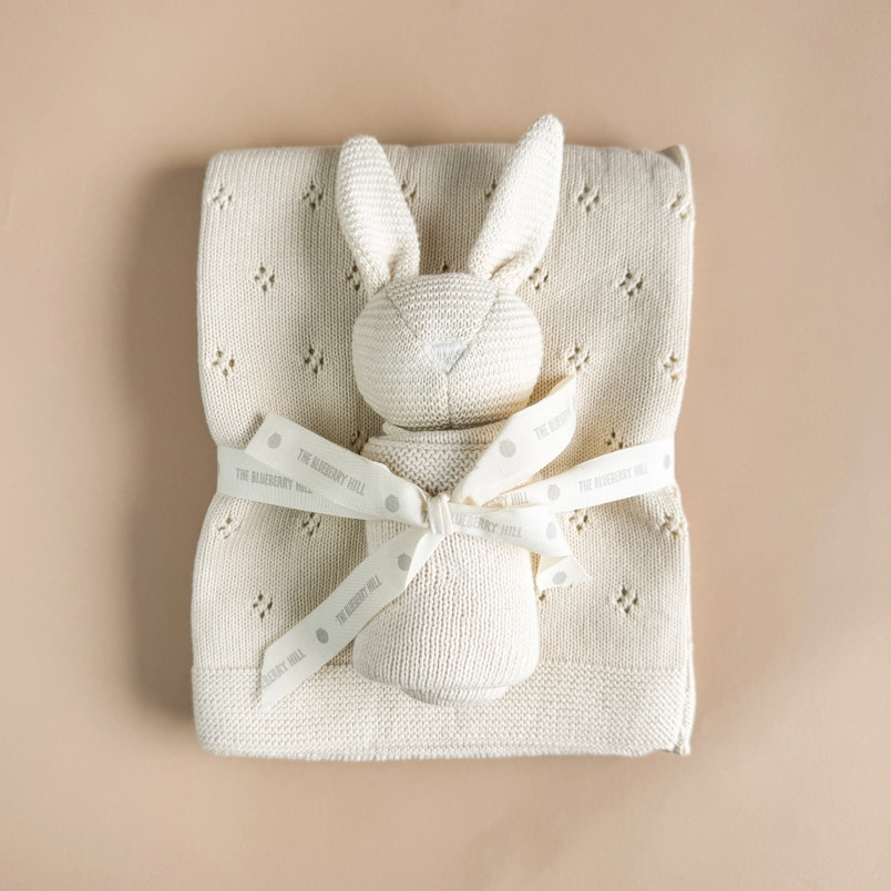 Delightfully soft and beautifully crafted, this blanket and plush bunny gift set from The Blueberry Hill is made from super soft organic cotton, offering comfort and charm for little ones from their very first days. Thoughtfully designed, this set combines a cozy knitted blanket with an adorable matching Bailey Bunny companion. The blanket features a delicate textured knit with subtle stitched details, creating a timeless and elegant look that complements any nursery. Paired with a cuddly knitted plush bunny, this set brings both warmth and a comforting friend for baby to snuggle. Beautifully presented and tied with a ribbon, this set makes a thoughtful baby shower or newborn gift.