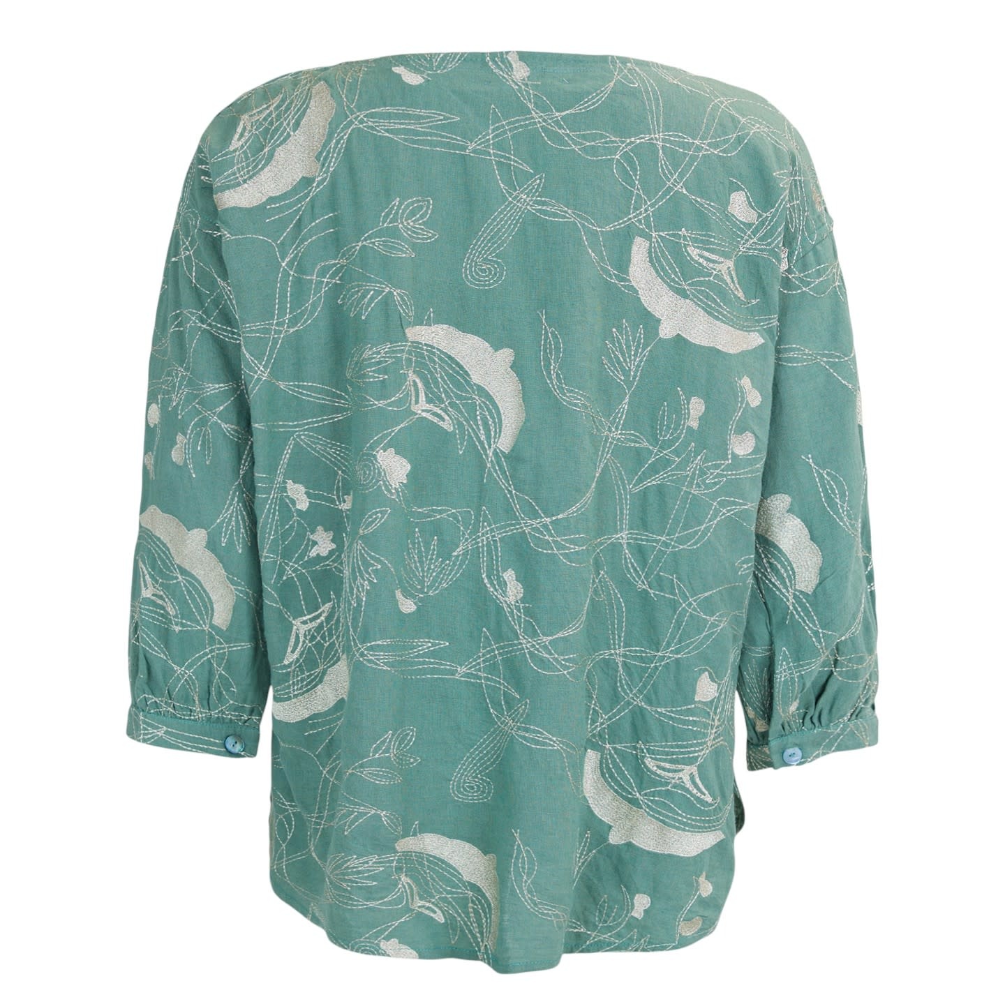 Effortlessly elegant and easy to wear, this green printed blouse from Noen features a beautifully fluid silhouette and an artistic botanical pattern that brings a fresh, natural feel to your wardrobe. The soft green backdrop is adorned with delicate silver linework forming abstract leaves and flowing stems, creating a light and graceful design. Crafted from a lightweight, breathable fabric, the blouse drapes softly for a comfortable and relaxed fit. It features a round neckline, three-quarter sleeves, and gently gathered cuffs with small button details, adding subtle structure while maintaining an airy look. Perfect for both casual and refined styling, this versatile blouse pairs beautifully with tailored trousers, denim, or skirts.