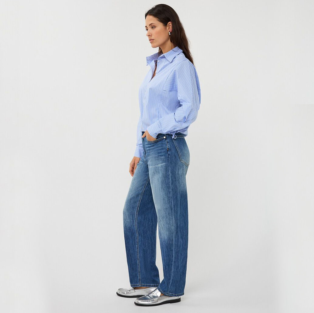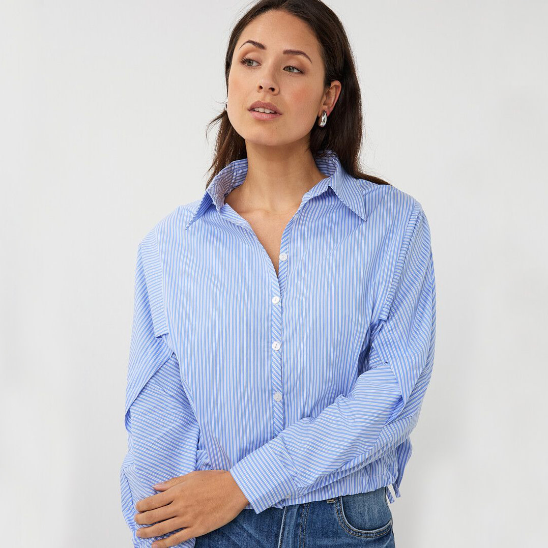 Fresh and contemporary, this striped cropped blouse from Esqualo redefines classic shirting with a modern twist. Designed with a relaxed batwing silhouette, it features a structured collar and button-down front for a polished feel. The soft blue-and-white stripes add a timeless touch, while the cropped length with adjustable side ties creates a flattering, customizable fit. Finished with voluminous sleeves and tailored cuffs, this blouse effortlessly balances comfort and style—perfect for pairing with high-waisted denim or tailored trousers.
