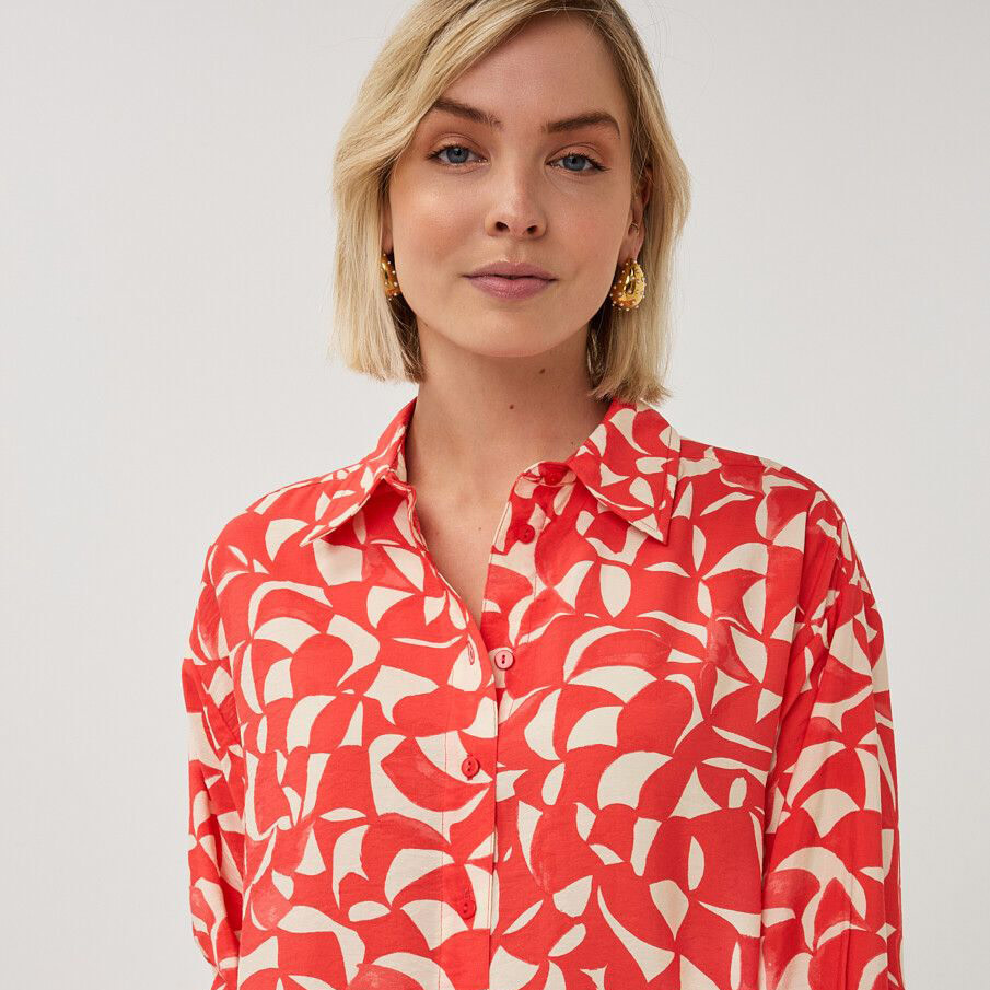 Bold and expressive, the Scarlet Graphic Wide Blouse from Esqualo brings a vibrant touch to everyday dressing. Designed with a relaxed, wide silhouette, it features a classic collar and button-down front for timeless appeal. The striking red and cream abstract print adds a modern, artistic edge, while the lightweight fabric ensures effortless movement and comfort. Finished with long sleeves and soft tailoring, this blouse is perfect for elevating both casual and polished looks.