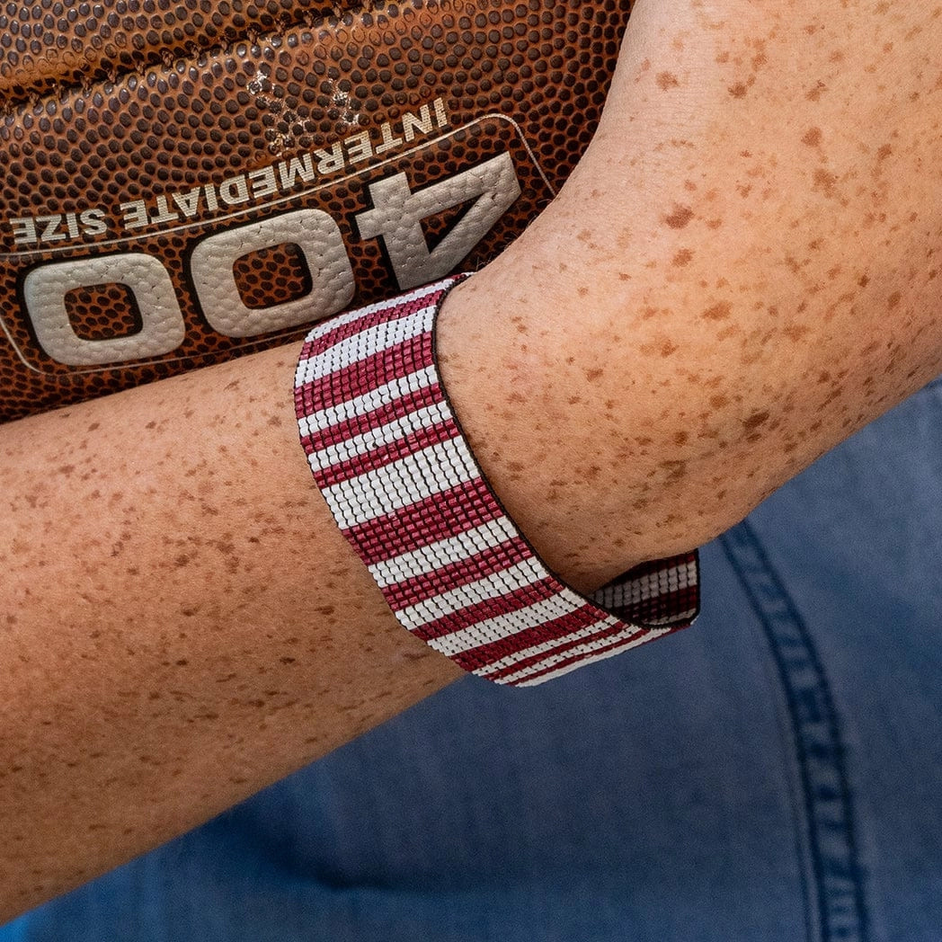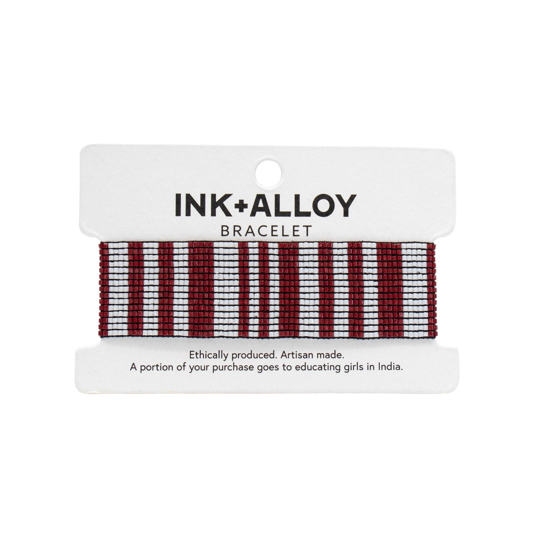 Classic with a modern edge, the Kenzie Beaded Vertical Stripes Bracelet from Ink + Allow features a clean, graphic pattern in rich dark red and crisp white. Handcrafted with tiny glass seed beads, the vertical stripe design creates a timeless look that’s easy to style and endlessly versatile. Made on a flexible, stretchy cord, ensuring a comfortable and adaptable fit for most wrist sizes. This bracelet is perfect worn alone for a refined statement or stacked with other favorites. A polished accessory that blends artisan craftsmanship with everyday elegance.