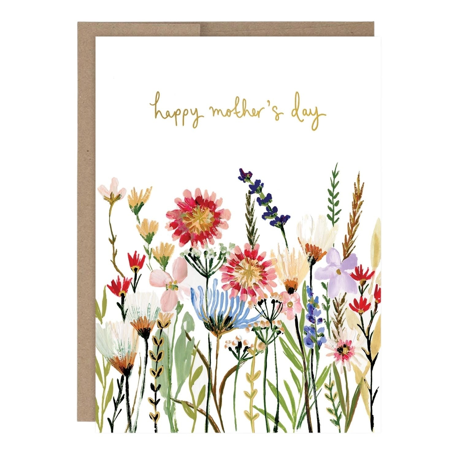 Celebrate Mom with this beautifully illustrated Mother’s Day greeting card, featuring a delicate arrangement of hand-painted wildflowers in soft, joyful colors. The charming botanical design brings a fresh, natural feel, perfectly complementing the elegant gold “happy mother’s day” lettering. A thoughtful keepsake that will brighten her day and make her feel truly special.