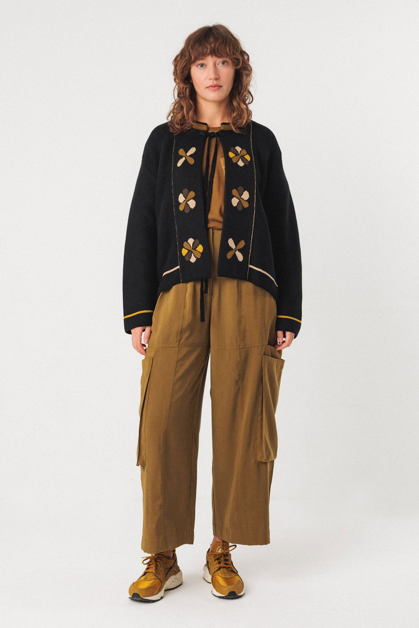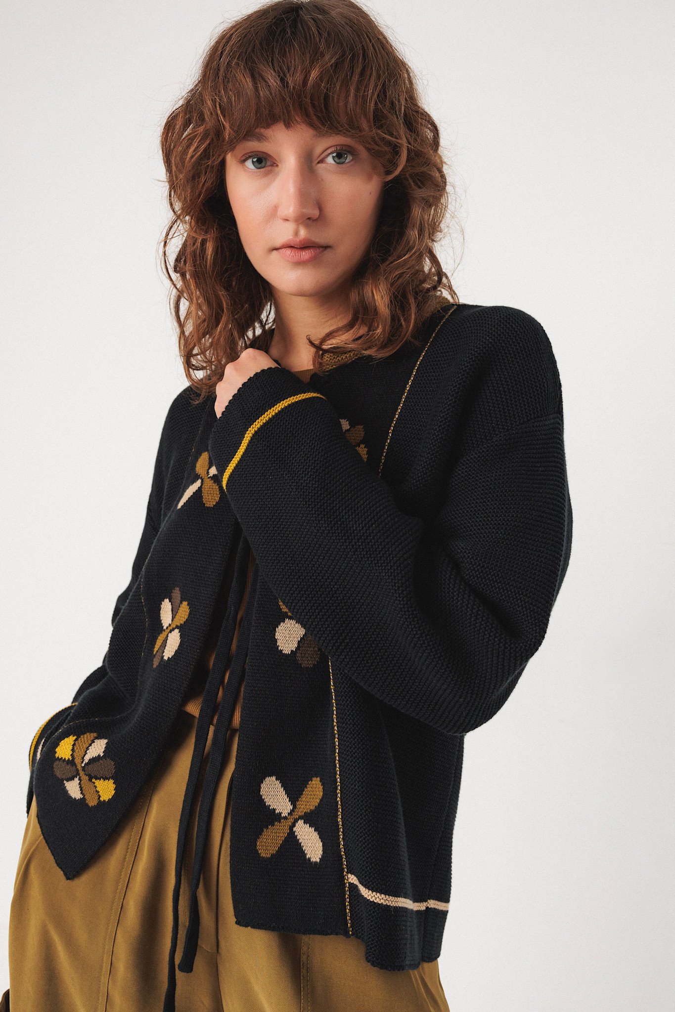 Rooted in tradition, refined for today. This heavyweight knit cardigan from SKFK takes cues from classic Basque mendigoizal jackets, featuring a distinctive knotted lace closure at the front. Crafted in black with beautiful olive green, cream, and brown details, it balances rugged charm with considered craftsmanship. The dense knit offers substantial warmth and structure, while the heritage-inspired accents add quiet character you’ll reach for season after season.