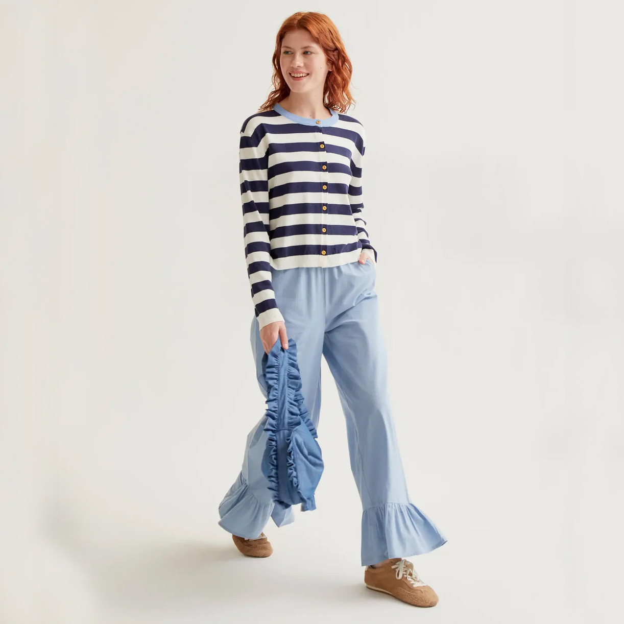 A fresh take on a timeless classic, this soft knit cardigan from Compania Fantastica features a crisp white and navy striped pattern for effortless everyday style. Designed with a contrasting light blue round neckline, it adds a subtle pop of color and a modern touch. The front button closure is finished with delicate yellow buttons, bringing a playful detail to the piece. Ribbed trim at the cuffs, neckline, and hem ensures a comfortable and structured fit. Perfect for layering over tees or dresses, this cardigan blends comfort with a polished, casual look.