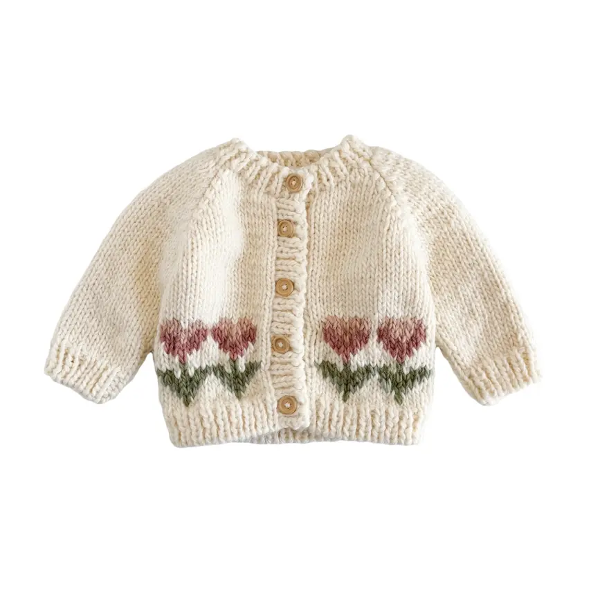 Wrap your little one in cozy charm with this hand-knit baby floral cardigan. Crafted with care, it features a classic button-front design, knit-in flowers in the front, and soft ribbed trim at the cuffs and hem for a snug, comfortable fit. Perfect for layering on chilly days, it adds a sweet, stylish touch to any outfit all season long.