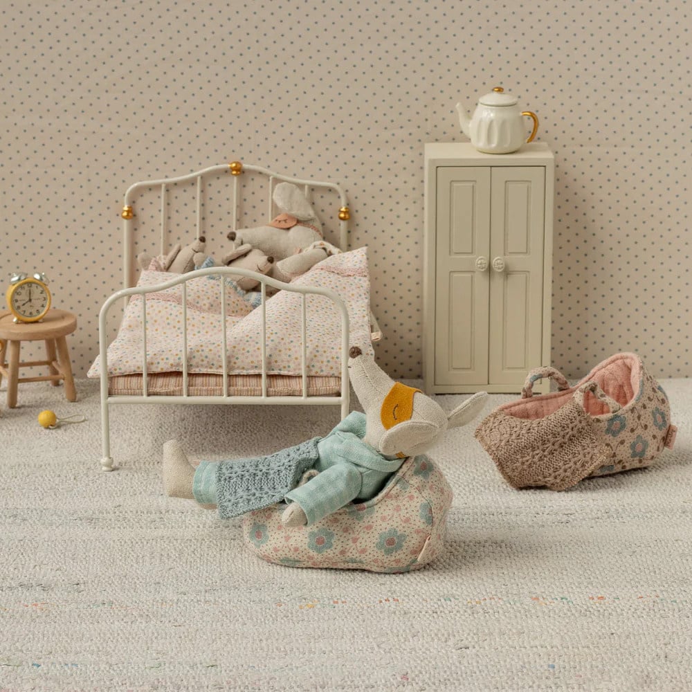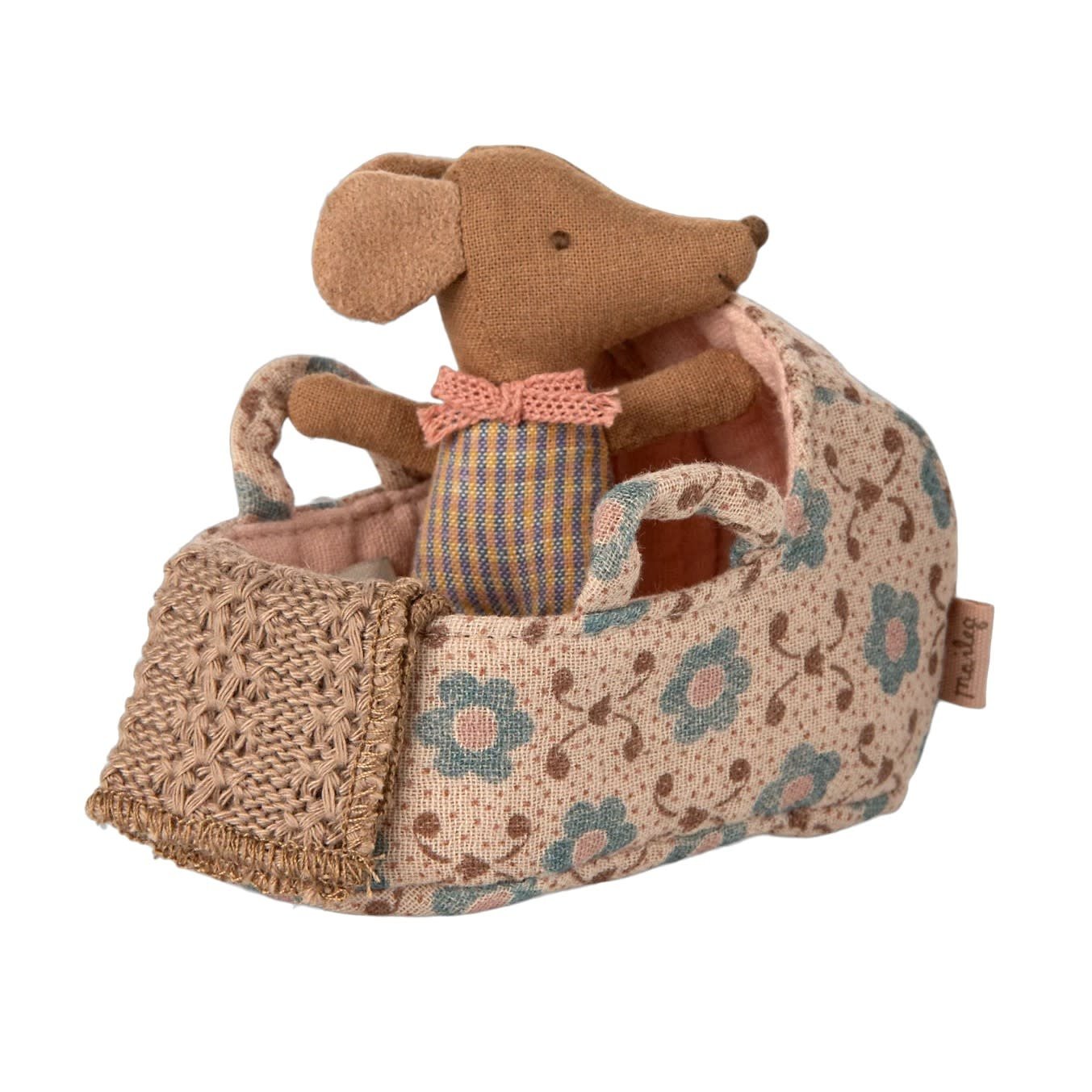 Bring your baby anywhere with this small carry cot Rose from Maileg. It will ensure your little one a cosy and safe place to sleep on the go. It fits all baby mice in size. Your friend will sleep tight under the warm knitted blanket.