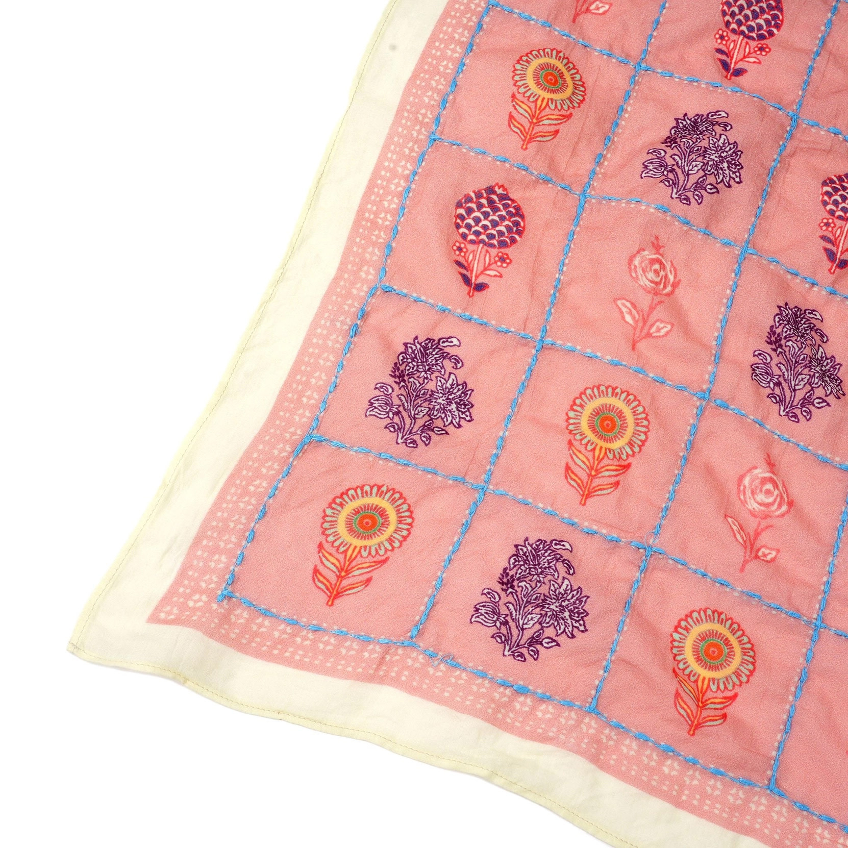 Soft, charming, and effortlessly versatile, the Flowerscape Tea Rose Cotton Bandana from Vismaya brings a fresh pop of color to any look. Crafted from lightweight, breathable cotton, this square scarf feels soft against the skin and is perfect for year-round styling. Set against a warm tea rose background, the design features delicate floral and botanical motifs accented with subtle fruit details, all framed by a soft cream border. Fine blue stitched lines create a gentle lattice effect, adding depth and a handcrafted feel to the playful print. Wear it tied at the neck, wrapped in your hair, or knotted onto a tote for a touch of personality. The Flowerscape Tea Rose bandana blends romantic florals with modern color contrast, making it a sweet yet sophisticated accessory for everyday wear.