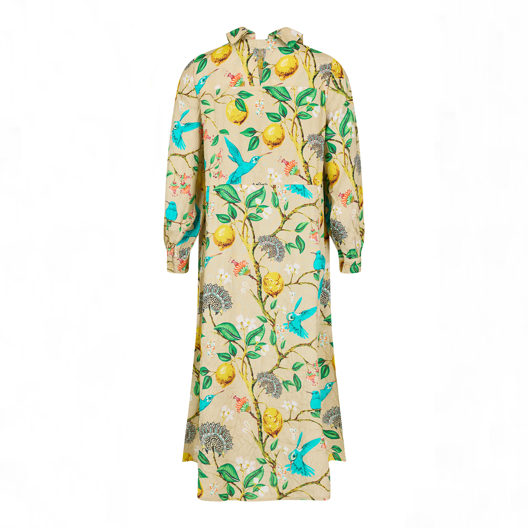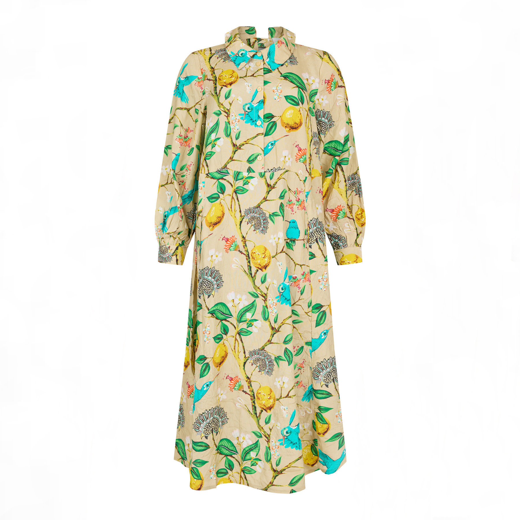 Fresh, vibrant, and full of charm, this floral midi dress from Noen brings a touch of nature-inspired elegance to your wardrobe. Crafted in a lightweight fabric, it features a beautifully detailed botanical print with lemons, blooming flowers, and delicate birds in lively hues against a soft neutral background. Designed with a relaxed, flowing silhouette, the dress offers both comfort and effortless style. It features a structured collar, a partial button-front placket, and long sleeves with gentle volume for a refined yet easygoing look. The midi length adds versatility, making it perfect for both casual days and elevated occasions.