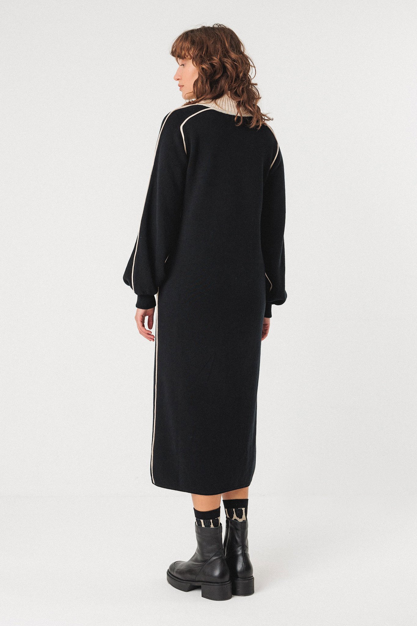 Effortless sophistication meets comfort in this mid-length black dress from SKFK, crafted from a medium-weight organic cotton knit for a soft yet structured feel. Designed with a straight cut and long balloon sleeves, it offers a refined silhouette that moves beautifully. The high ribbed collar and contrast piping add a modern, elevated touch, making it as chic for daytime wear as it is for evening outings.
