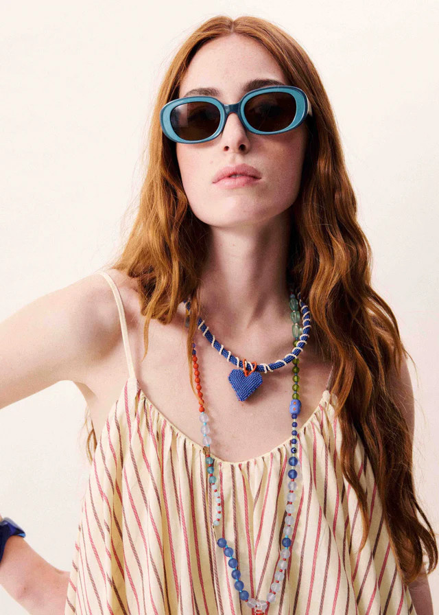 Effortlessly light and beautifully fluid, the Poroa Butter dress from Frnch is designed for easy, sun-filled days. Crafted in a soft ecru base with delicate vertical stripes in pink, orange, and beige, it offers a subtle yet playful palette that feels both fresh and timeless. This midi-length silhouette features thin adjustable straps and an elasticated gathered neckline, creating a soft drape and relaxed, airy shape. The loose, flared cut allows for graceful movement, making it as comfortable as it is elegant. Perfect for warm weather or layered styling, this dress brings together simplicity and charm with its flowing design and understated color story—an easy piece to wear from day to evening.