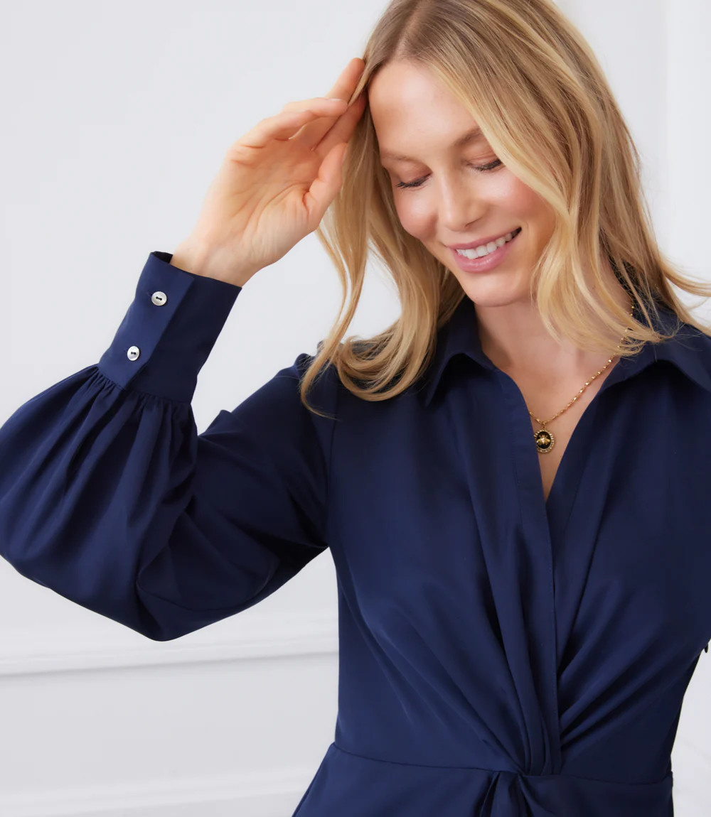Elevate your look with this sophisticated midi dress Savannah from Karen Kane, crafted from smooth satin-woven fabric for a subtle sheen. Designed with long sleeves and a classic collar, it features a flattering twist-front detail that creates a beautifully draped silhouette. The tulip hem adds a soft, feminine touch, making it perfect for both day and evening occasions.