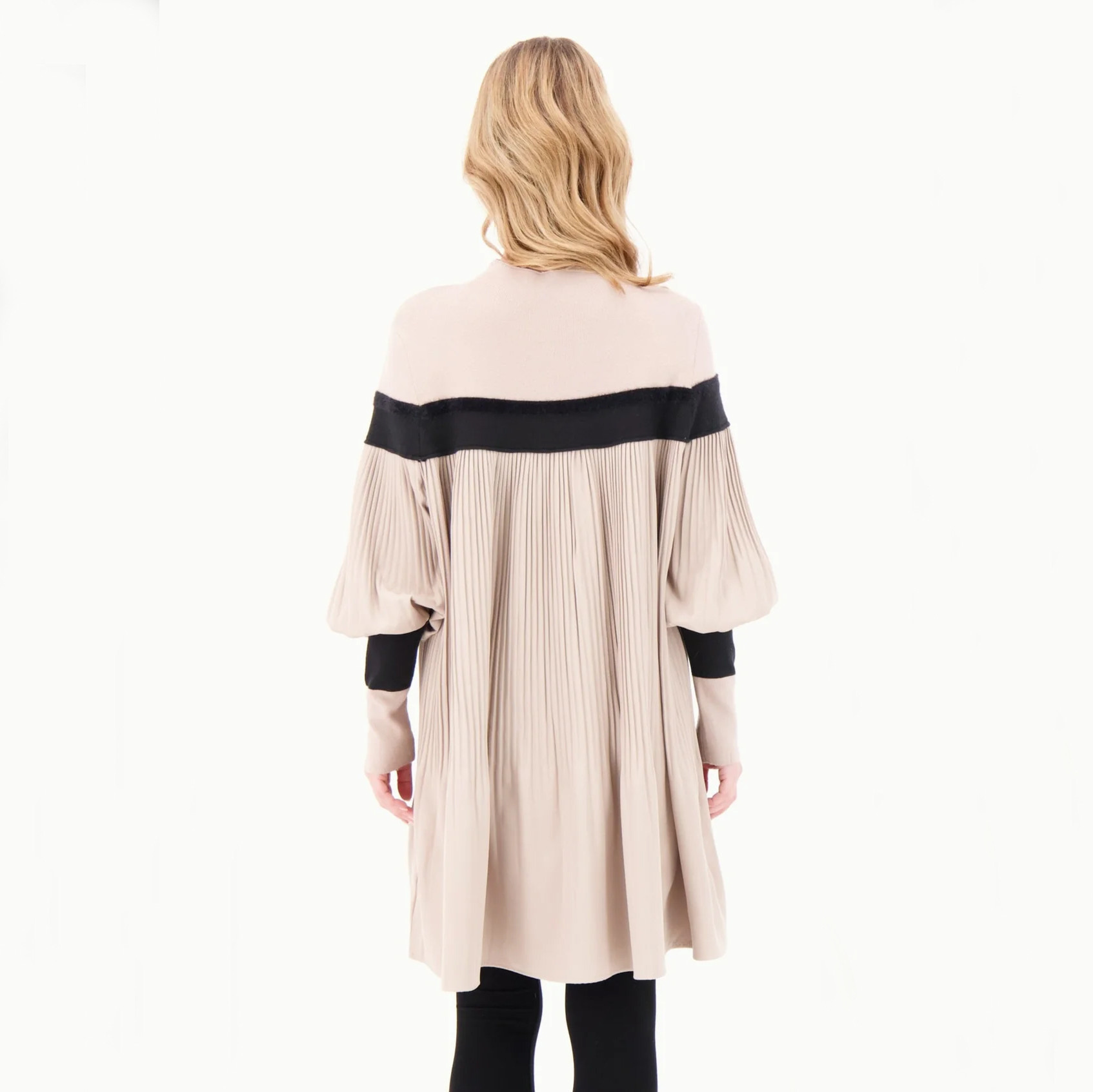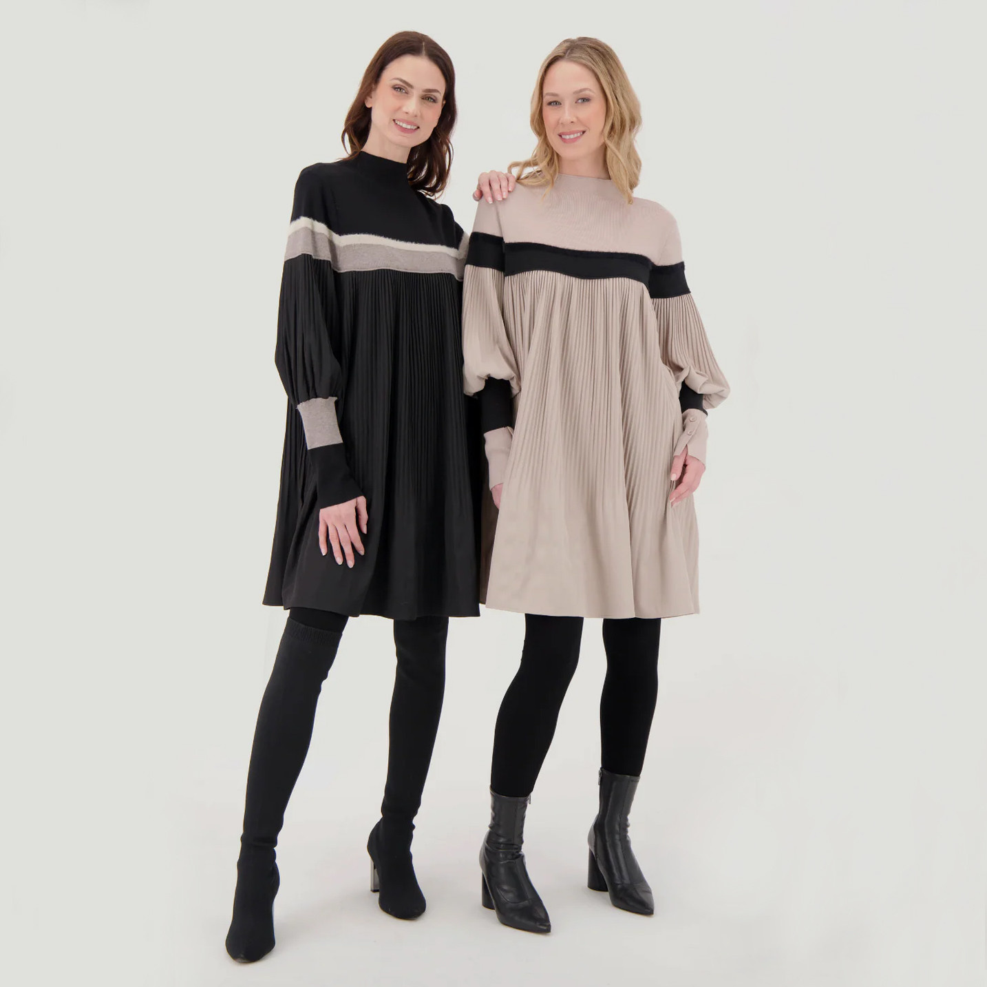 Meet your new go-to: a stunning pleated stripe tunic dress in sand—a true Fall must-have. Wear it long as a dress for date night or style it as a tunic with leggings and boots. The silhouette is comfortable yet chic, with flowy, figure-flattering pleats that move beautifully. Buttoned sleeve cuffs add a polished touch, while the airy drape keeps it effortless from day to night.