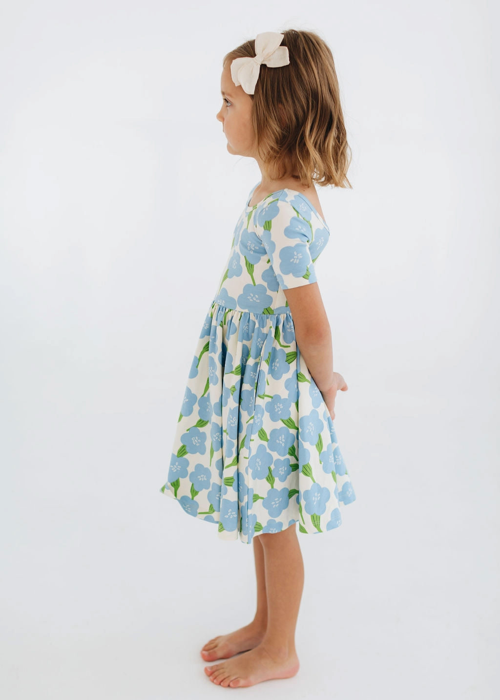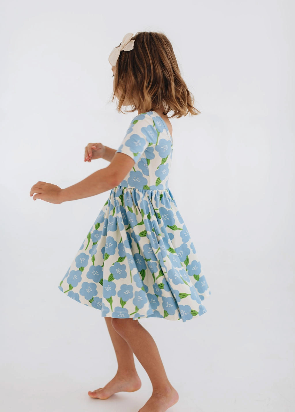 Fresh, charming, and made for everyday magic, the Good Apples Kids Twirl Dress in Blue Garden brings comfort and style together beautifully. Crafted from stretchy-soft organic cotton, this dress is designed with a ballet-inspired silhouette that moves effortlessly with every spin. The fitted bodice and sleeves create a sweet, classic shape, while the full circle skirt is perfect for endless twirling. A graceful scooped back adds a delicate touch, and hidden side pockets make it easy to carry little treasures wherever the day leads. Featuring a soft blue floral garden print on a light background, this dress is perfect for playdates, special occasions, or simply dancing through the day.