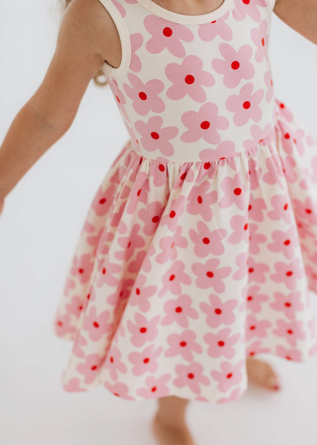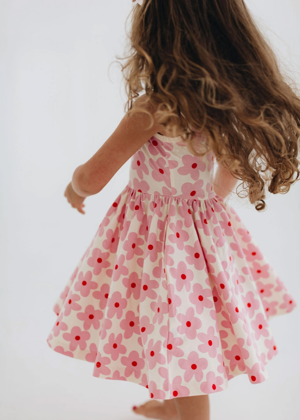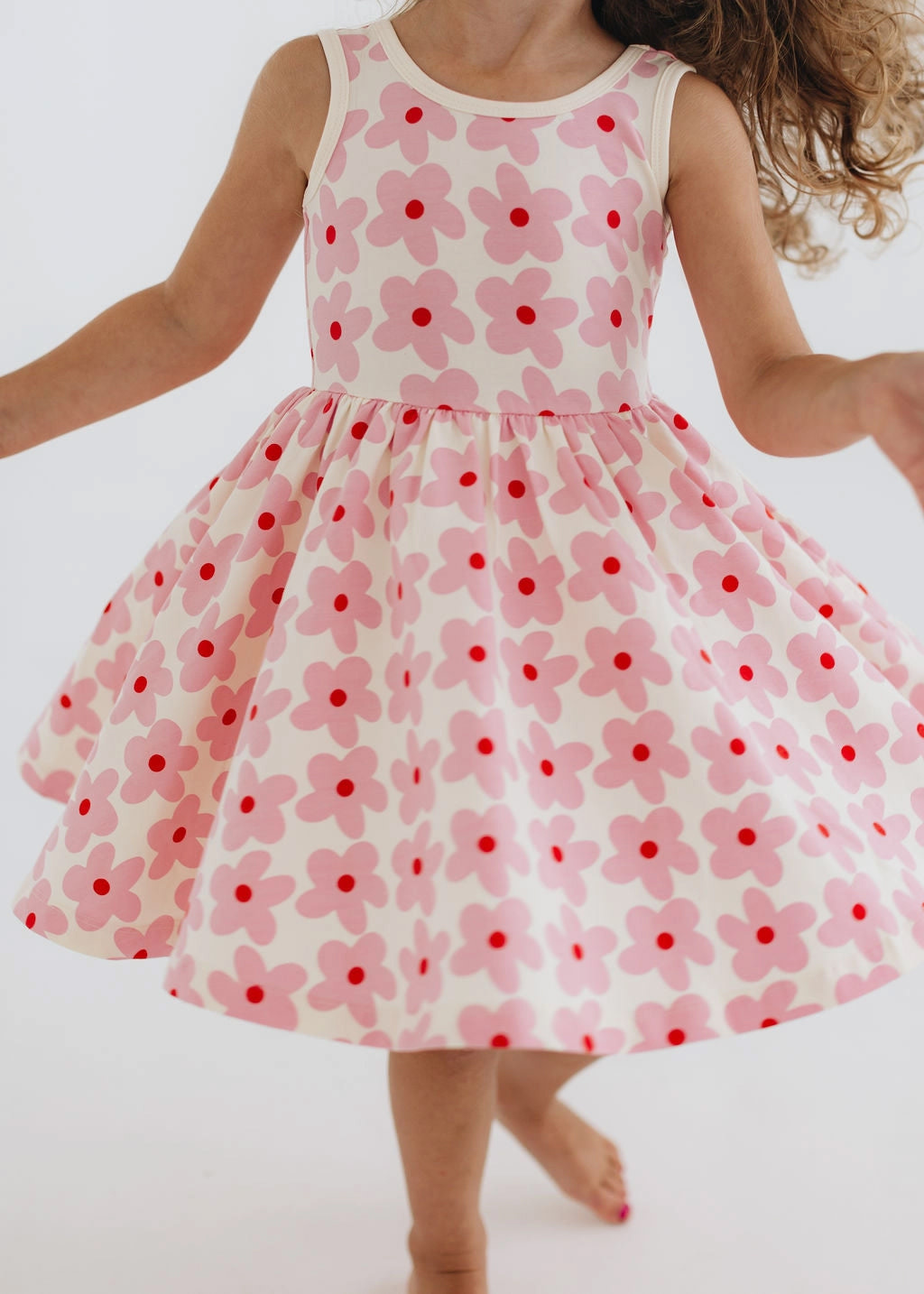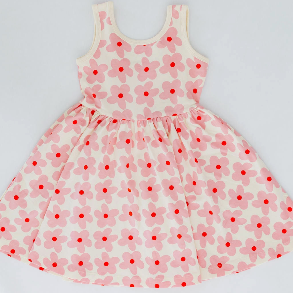 Sweet, playful, and made for movement, the Good Apples Kids Twirl Dress in Pink Daisies is a little one’s dream come true. Crafted from stretchy-soft organic cotton, this charming dress combines everyday comfort with a ballet-inspired silhouette. The fitted bodice flows into a full circle skirt designed for maximum twirl, while the graceful scooped back adds a delicate, stylish touch. Thoughtfully designed with hidden side pockets, it’s perfect for carrying tiny treasures on every adventure. Featuring a cheerful pink daisy print on a soft background, this dress is as fun as it is functional—ideal for playdates, parties, or simply spinning around all day long.