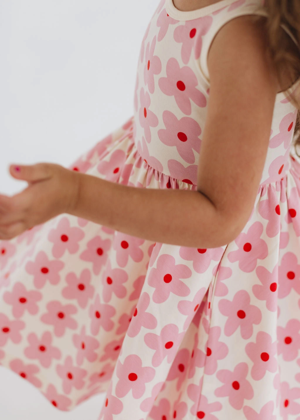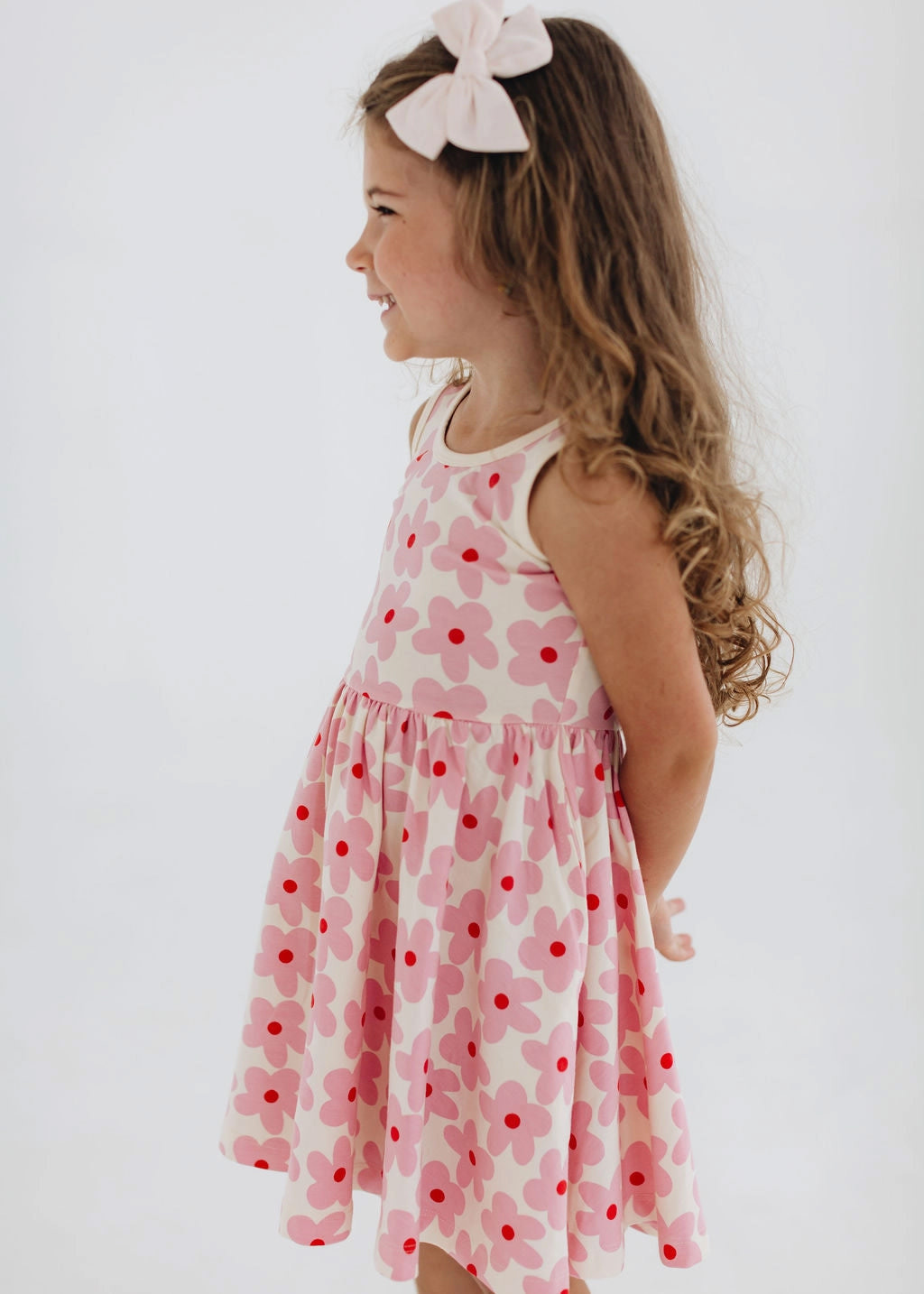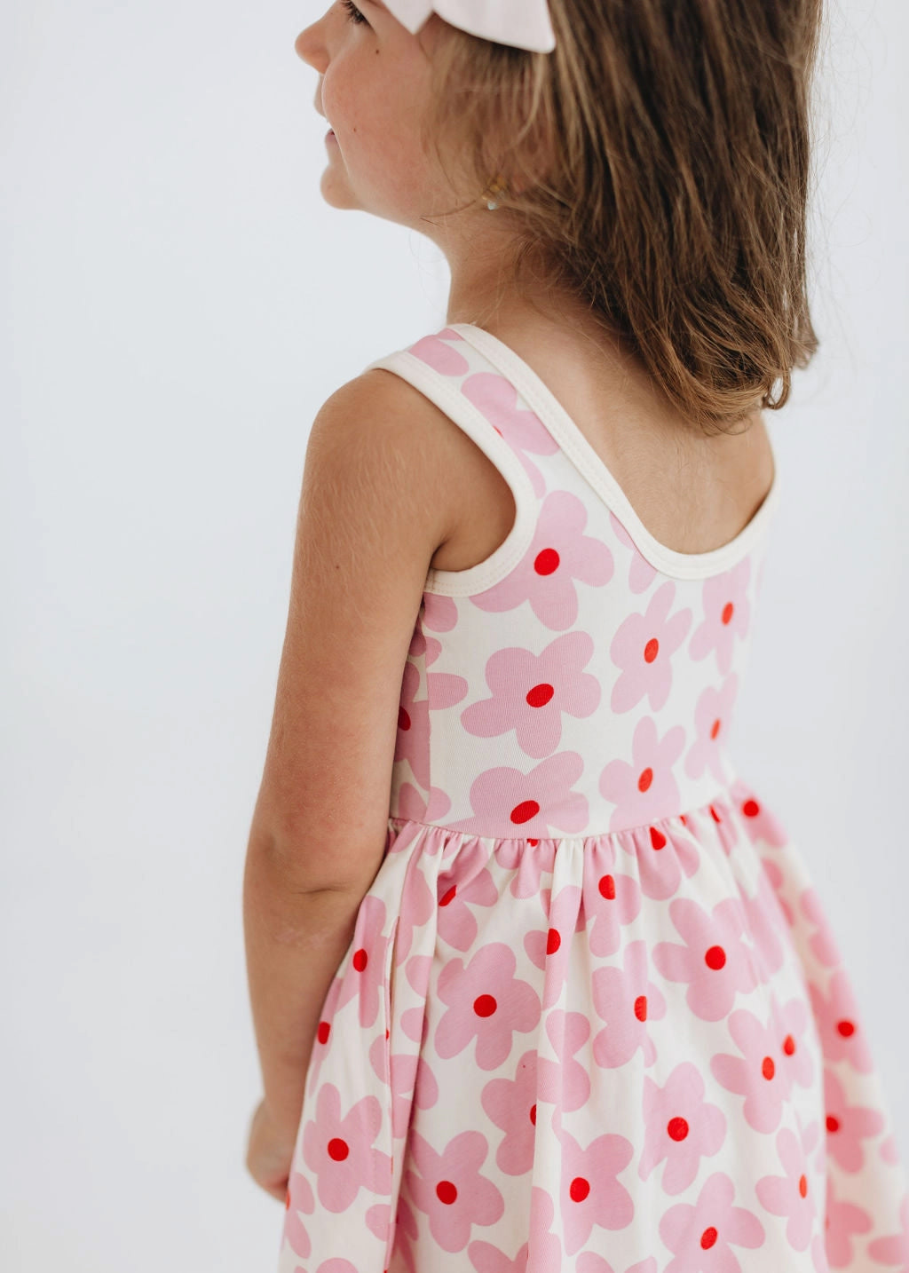 Sweet, playful, and made for movement, the Good Apples Kids Twirl Dress in Pink Daisies is a little one’s dream come true. Crafted from stretchy-soft organic cotton, this charming dress combines everyday comfort with a ballet-inspired silhouette. The fitted bodice flows into a full circle skirt designed for maximum twirl, while the graceful scooped back adds a delicate, stylish touch. Thoughtfully designed with hidden side pockets, it’s perfect for carrying tiny treasures on every adventure. Featuring a cheerful pink daisy print on a soft background, this dress is as fun as it is functional—ideal for playdates, parties, or simply spinning around all day long.