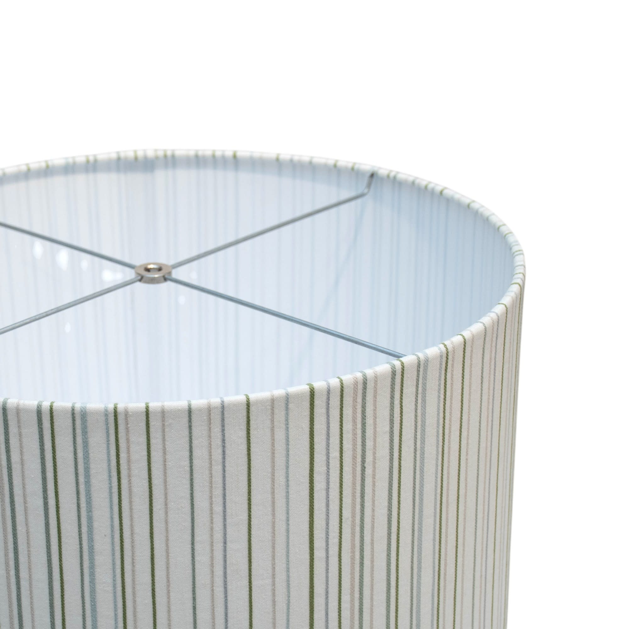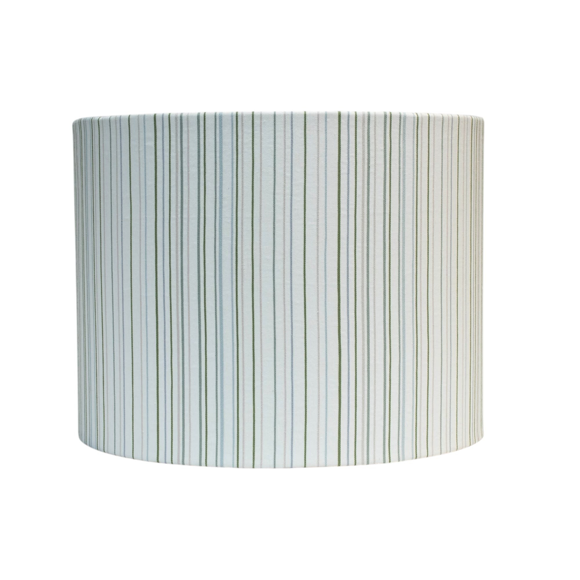 The Kreatelier Fabric Lampshade Stripes Green & Blue 18"D x 14"H is a locally handmade drum shade covered with a stylish fabric.