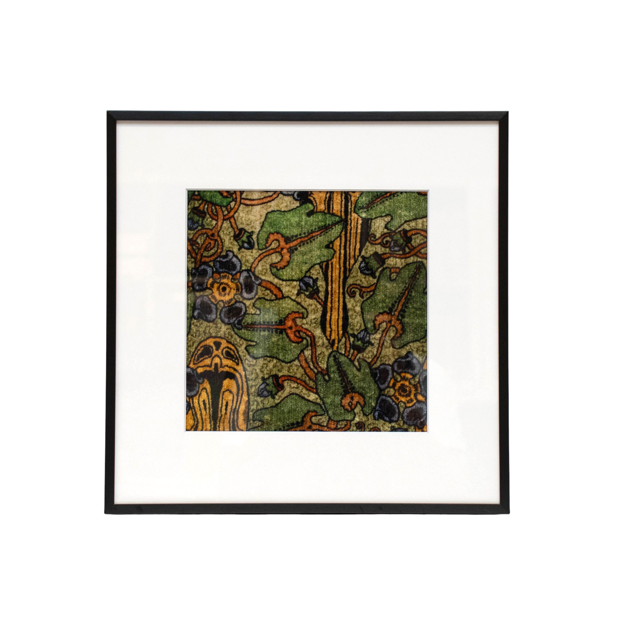 Instant wall art created with a beautiful and colorful fabric remnant. This fabric is framed in a 12" X 12" metal black frame with glass front. The fabric display measures 8" X 8".