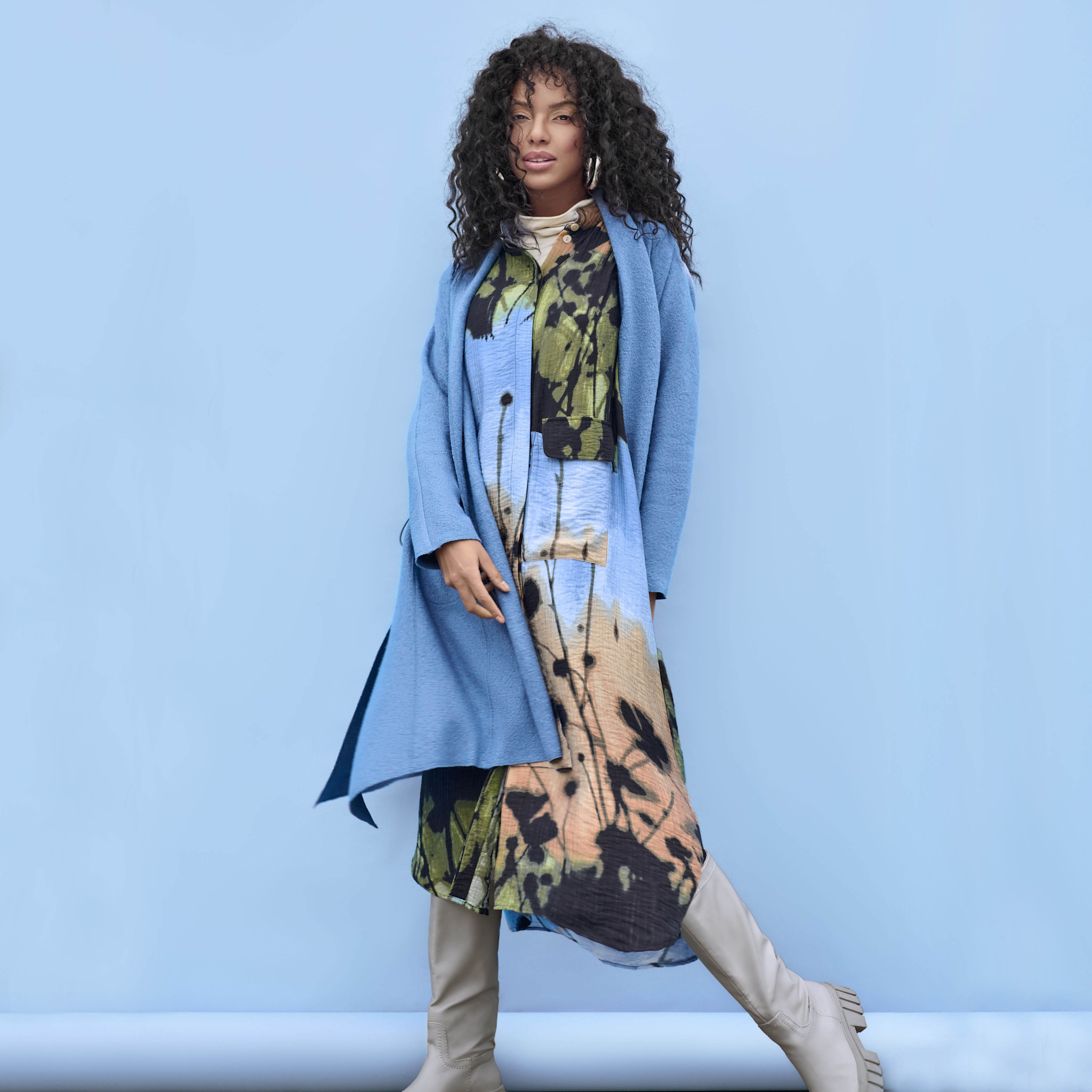 Stay cozy in style with this beautifully crafted blue wool jacket from Noen. Designed for both comfort and versatility, it features an elasticated waist for a flattering, adjustable fit. The soft wool fabric provides warmth without bulk, while the relaxed collar and spacious side pockets add practical elegance. Perfect for layering, this jacket brings effortless sophistication to cooler days.