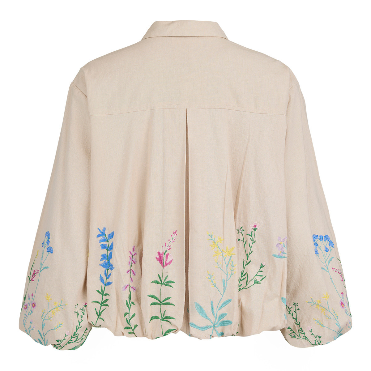Delicate artistry meets effortless style in this beautifully embroidered jacket from Noen. Crafted in a soft, neutral-toned fabric, it features vibrant floral embroidery inspired by wild garden blooms, adding a fresh and whimsical touch to the design. The relaxed silhouette is complemented by voluminous sleeves with gentle gathering at the cuffs, creating a soft, airy shape. A front zip closure and structured collar balance the feminine details with a modern edge, while the slightly cropped length with an elasticized hem offers a flattering, easy fit. Lightweight and versatile, this jacket is perfect for layering—bringing color, texture, and charm to both casual and elevated looks.