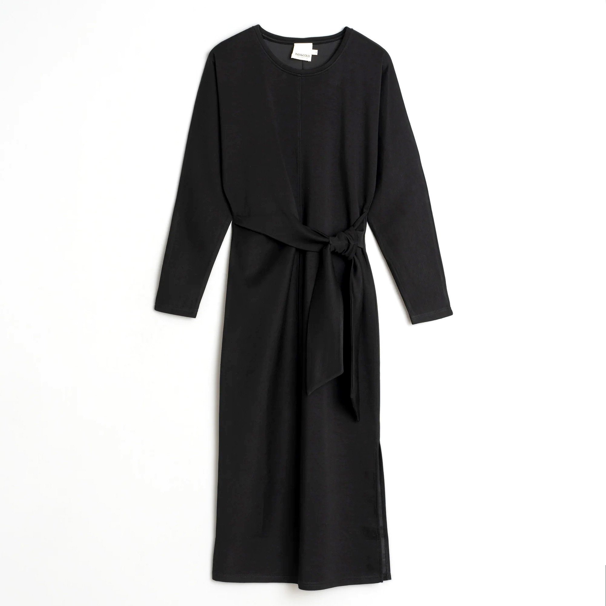 Effortlessly chic and endlessly wearable, this knitted dress combines comfort with flattering design. Crafted from soft, drapey knit fabric, it flows beautifully on the body while offering a relaxed yet elegant silhouette. The waist is adjustable with a drawstring, allowing you to customize the fit for definition and ease. A side slit adds a subtle hint of movement and modern edge. Whether dressed up with boots or down with sneakers, this piece is the perfect blend of style and versatility — your go-to for any occasion.