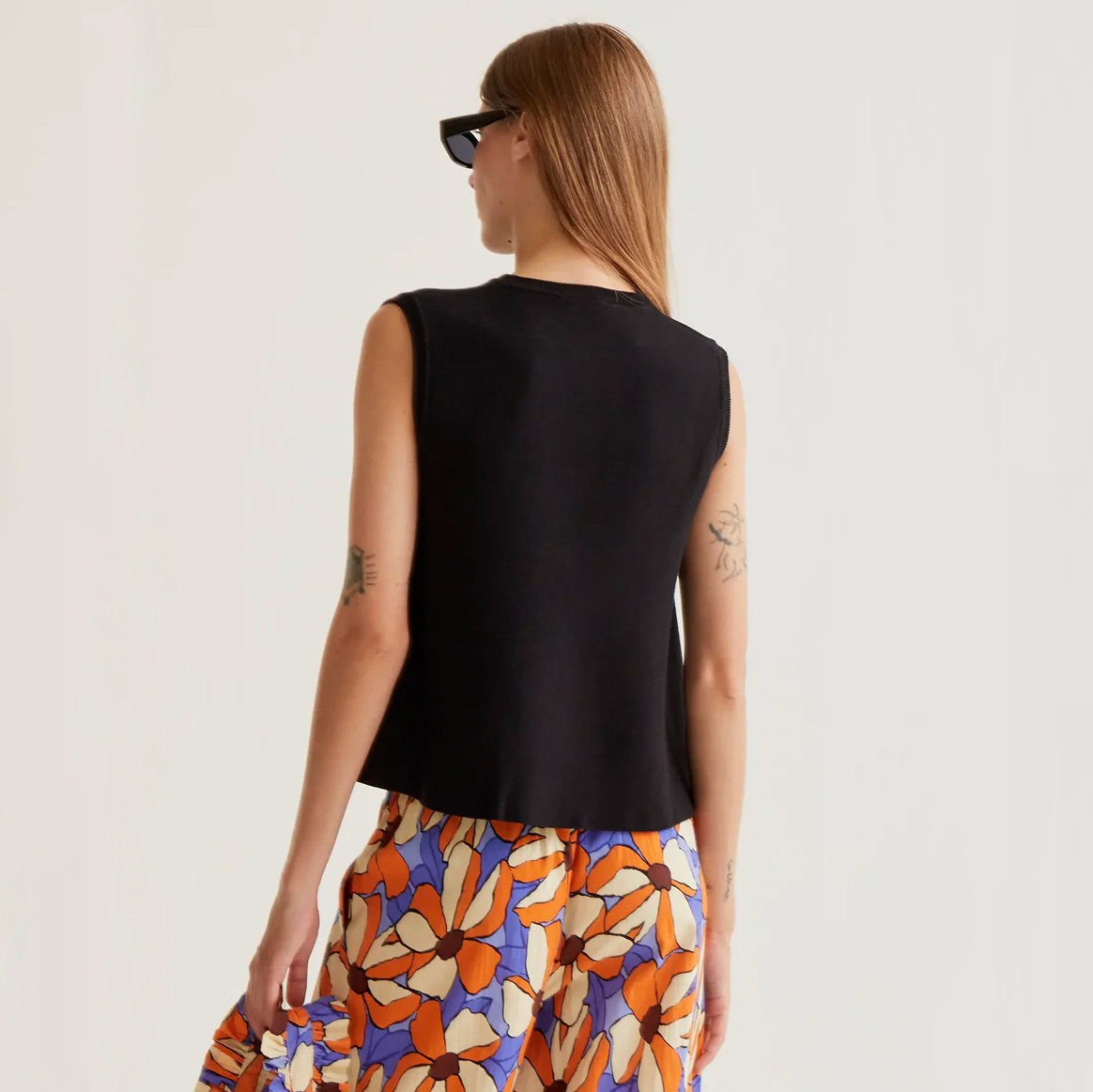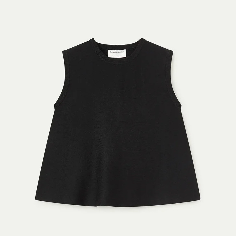 A timeless essential with a modern, minimal feel, this black knit top from Compania Fantastica is designed for effortless everyday styling. Crafted from soft, comfortable knit fabric, it offers a smooth texture and an easy, breathable fit. Featuring a classic round neckline and a sleeveless silhouette, it drapes into a slightly flared shape for a relaxed yet flattering look. Clean ribbed trim details add subtle structure, making it perfect for layering or wearing on its own. Versatile and chic, it pairs seamlessly with everything from tailored trousers to printed skirts.