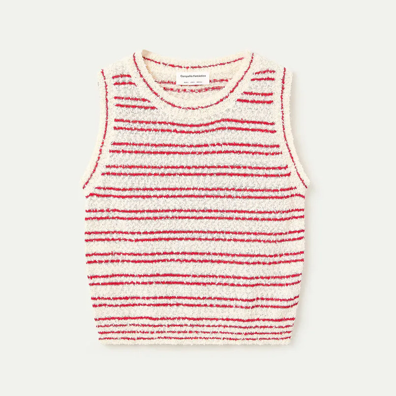 Cozy meets effortless style in this soft, slightly textured knit top from Compania Fantastica featuring delicate red stripe detailing. Designed with a classic round neckline and sleeveless silhouette, it offers a flattering and easy-to-wear fit for any season. The tactile knit adds subtle dimension, while ribbed trim details provide a clean, polished finish. Perfect for layering or wearing on its own, this versatile piece pairs beautifully with denim, tailored trousers, or skirts for a relaxed yet refined look.