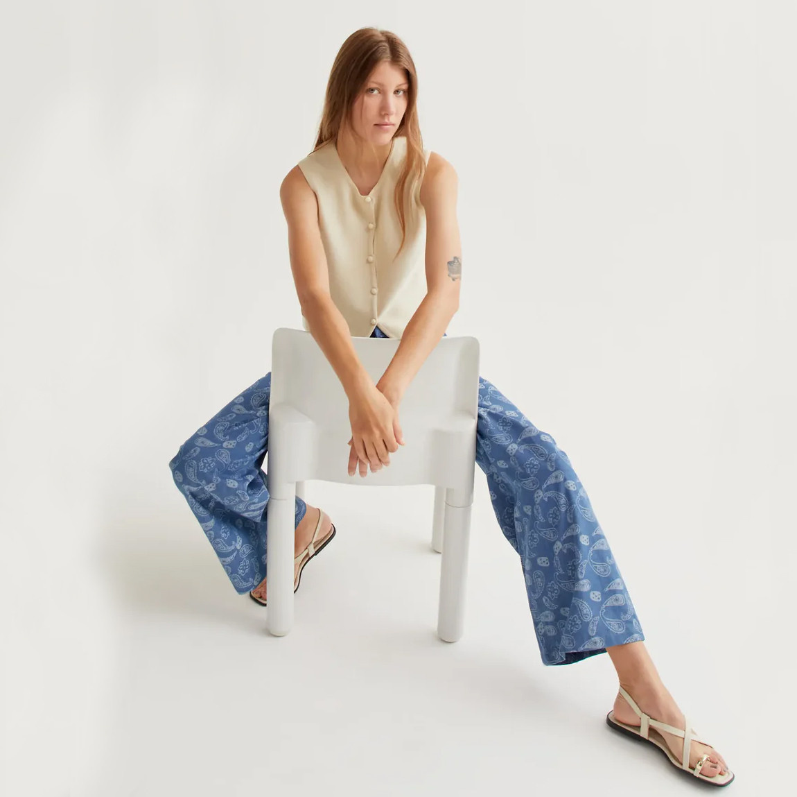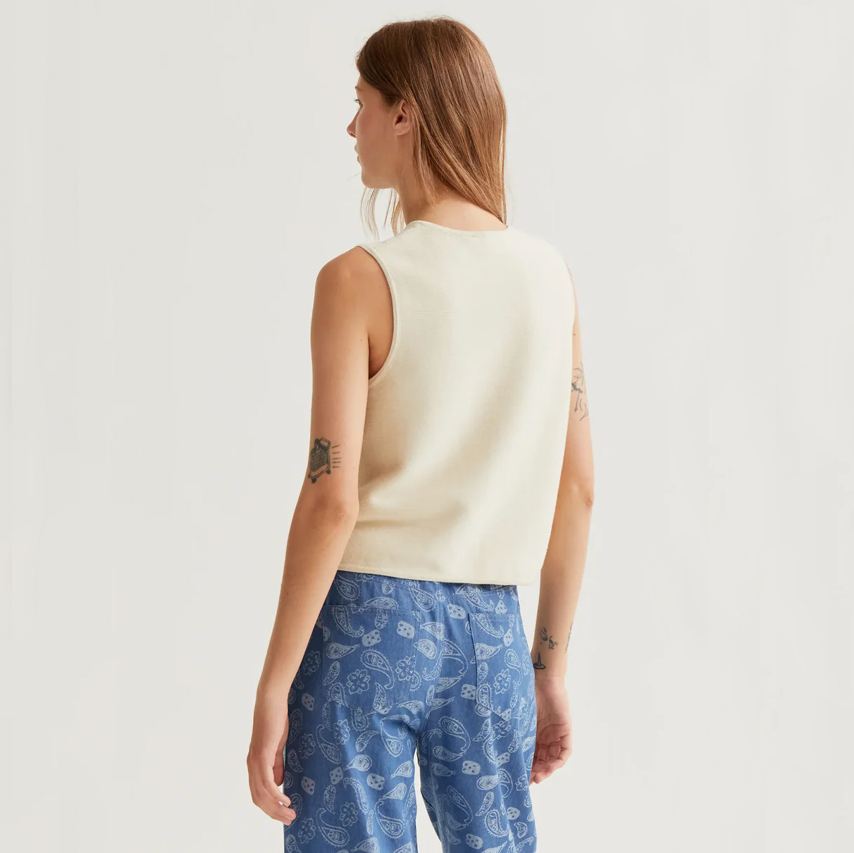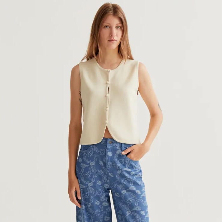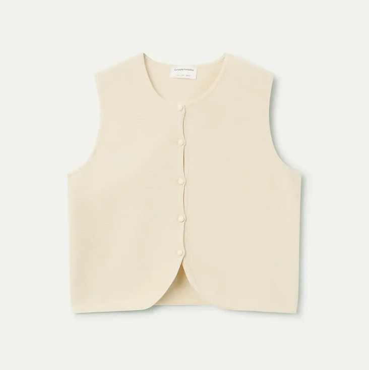 A soft and versatile layering piece, this beige knitted vest from Compania Fantastica blends simplicity with effortless elegance. Crafted from a smooth knit fabric, it offers a comfortable feel with a clean, structured silhouette. Designed with a round neckline and a sleeveless cut, it features a front button closure for a classic touch. The slightly cropped length and minimal design make it easy to pair with high-waisted trousers, skirts, or layered over shirts for a refined, modern look.