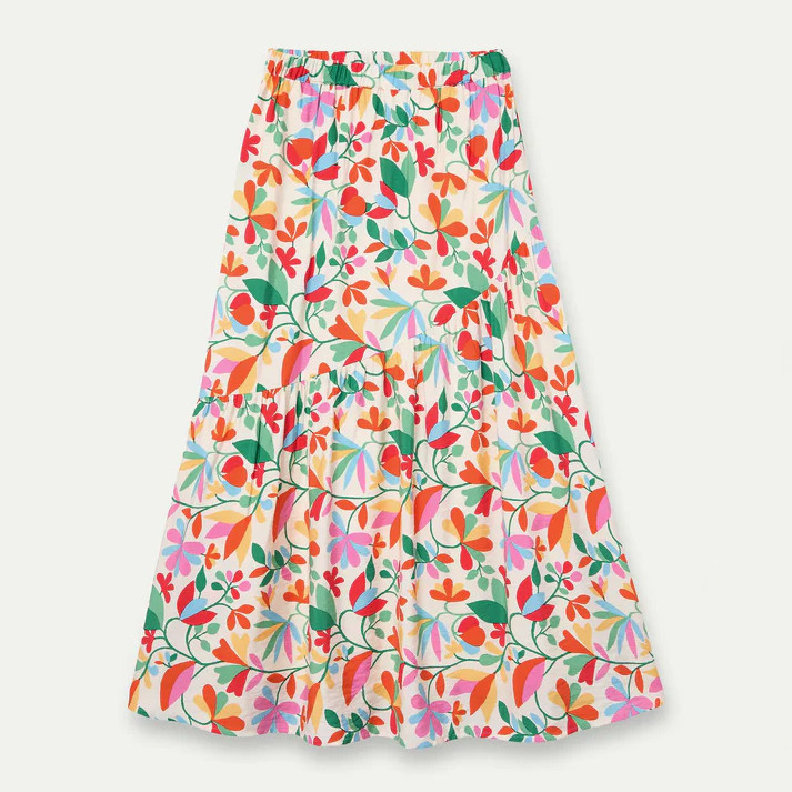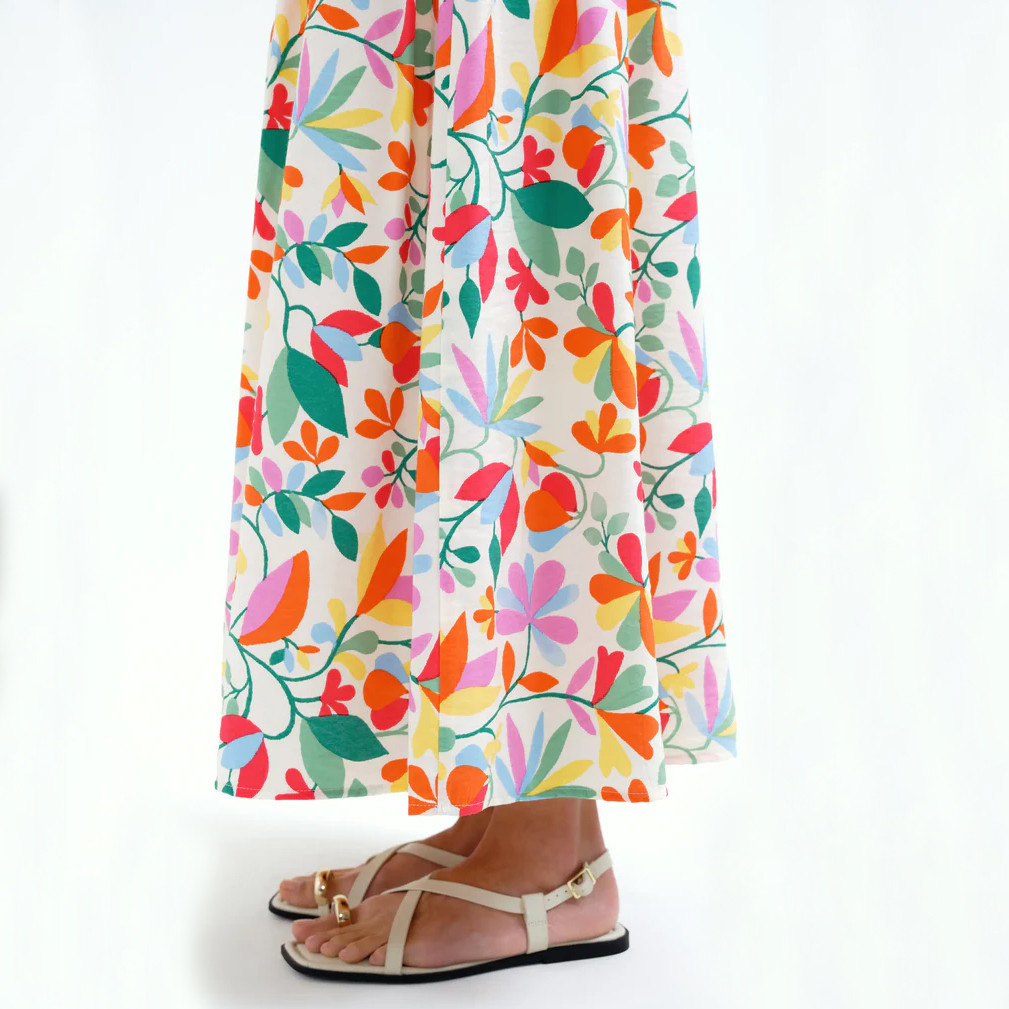 Fresh and full of movement, this long crepe skirt features a vibrant lotus-inspired print that brings a playful, colorful touch to any outfit. Crafted from lightweight fabric, it offers a soft, fluid drape that moves beautifully with every step. Designed with a high-waisted elastic waistband, it ensures a comfortable and flattering fit. The asymmetrical cut adds a modern, feminine silhouette, enhancing the skirt’s effortless elegance. Perfect for warm days or relaxed outings, it pairs easily with simple tops to let the print shine.