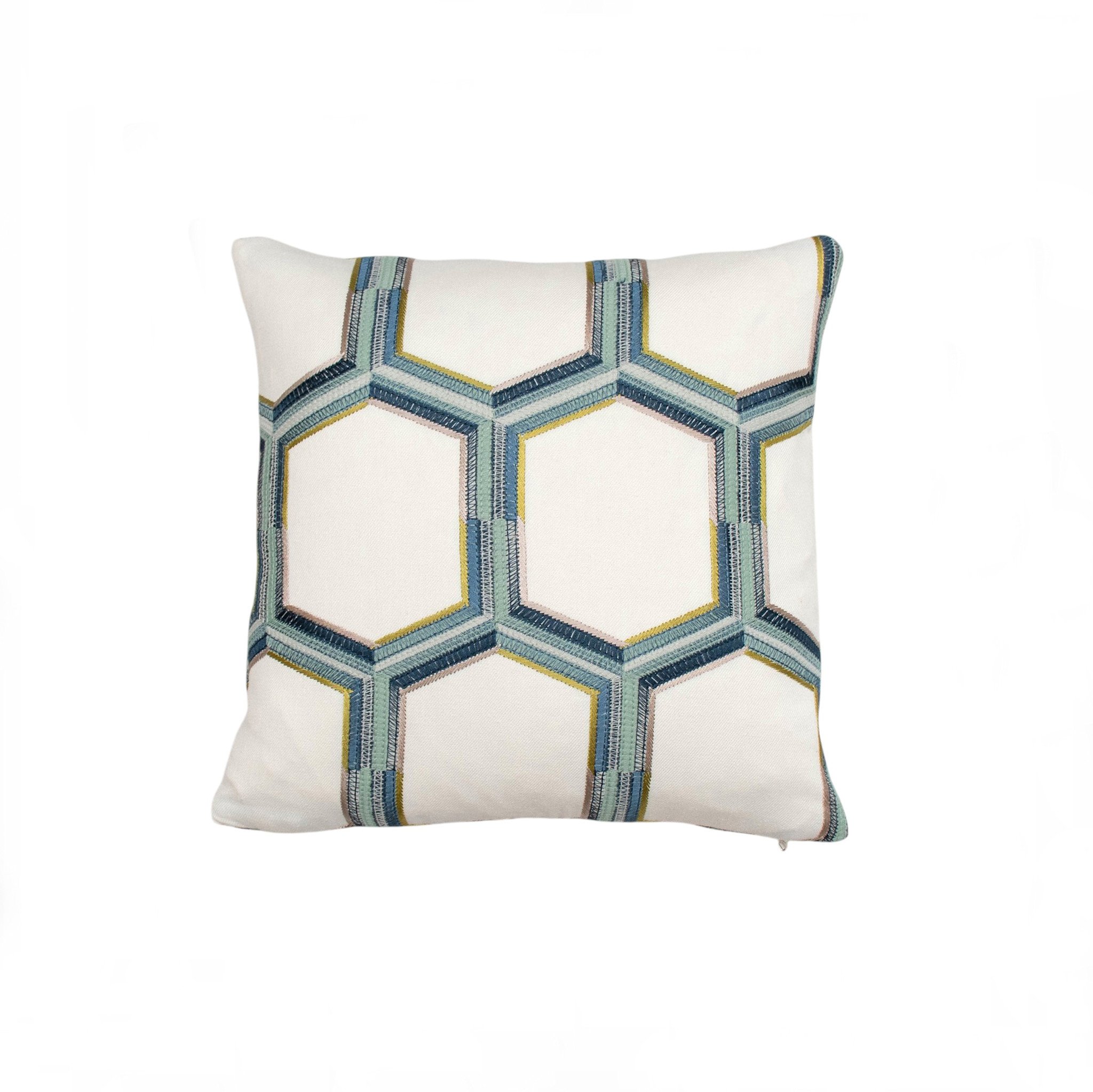 Add a modern touch of texture and pattern to your décor with this embroidered hexagon mini pillow from Kreatelier. Set against a soft neutral background, the design features a striking geometric pattern of interlocking hexagons beautifully stitched in layered shades of blue, teal, and subtle golden accents. The detailed embroidery gives the pillow dimension and a refined handcrafted feel. A stylish decorative accent that brings structure, texture, and a touch of sophistication to any space.