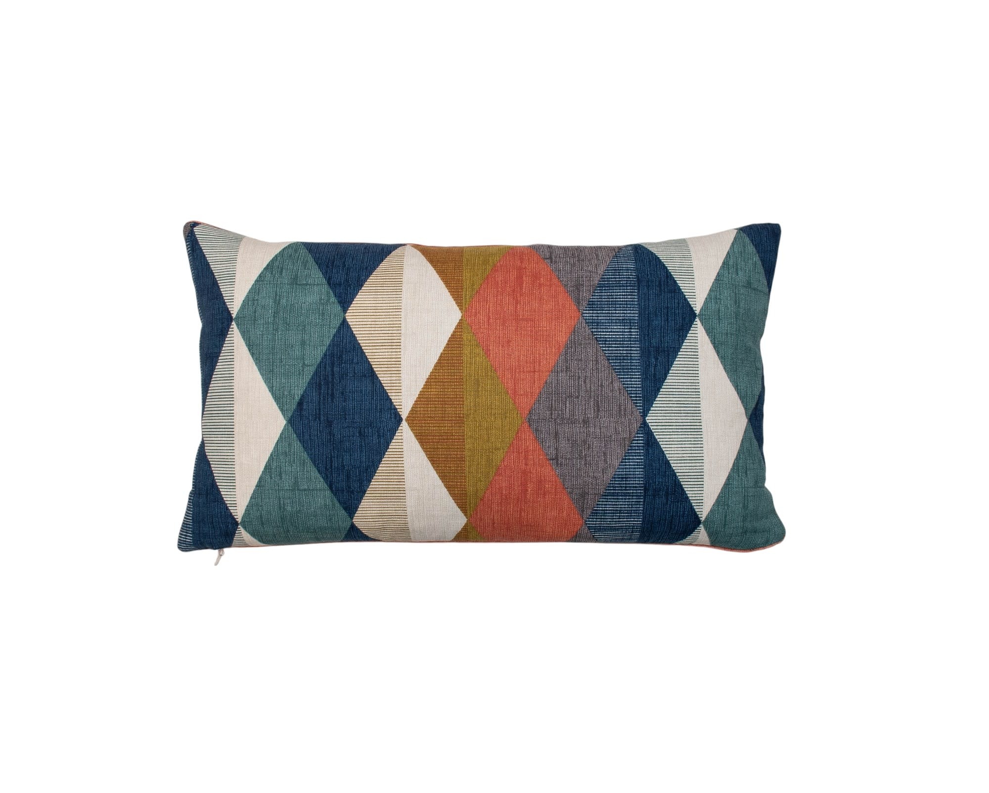 Bring bold mid-century charm to your space with the Denver Retro Pillow from Kreatelier. Designed in an eye-catching harlequin diamond pattern, this lumbar accent features a rich blend of teal, navy, coral, mustard, soft grey, and warm ivory—creating a perfectly balanced mix of cool and earthy tones. Whether paired with neutral furnishings for a pop of color or styled in an eclectic setting, the Denver Retro Pillow delivers timeless character and effortless sophistication to any room.