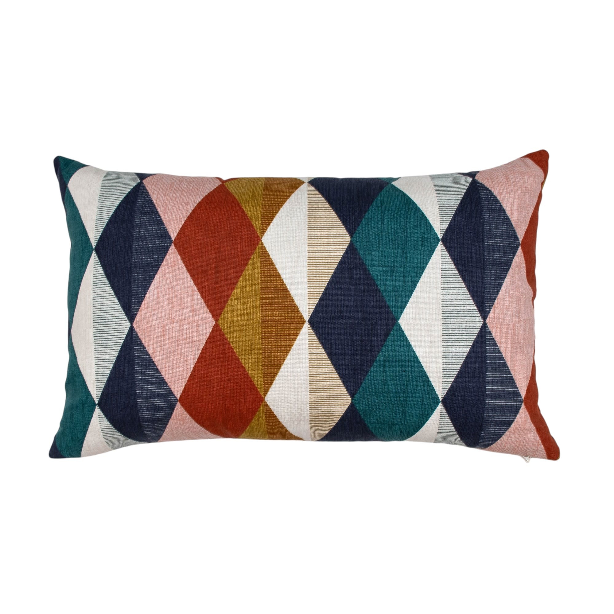 Bold and playful, the Denver Retro pillow brings a vibrant mid-century modern flair to your space. Featuring a striking geometric pattern of overlapping diamond shapes, the design combines rich tones of teal, navy, rust, mustard, and soft blush for a dynamic yet balanced look. Crafted from high-quality fabric, this pillow offers both durability and comfort, making it perfect for everyday use. The mix of colors and textures adds depth and visual interest, making it a standout accent on sofas, chairs, or beds.