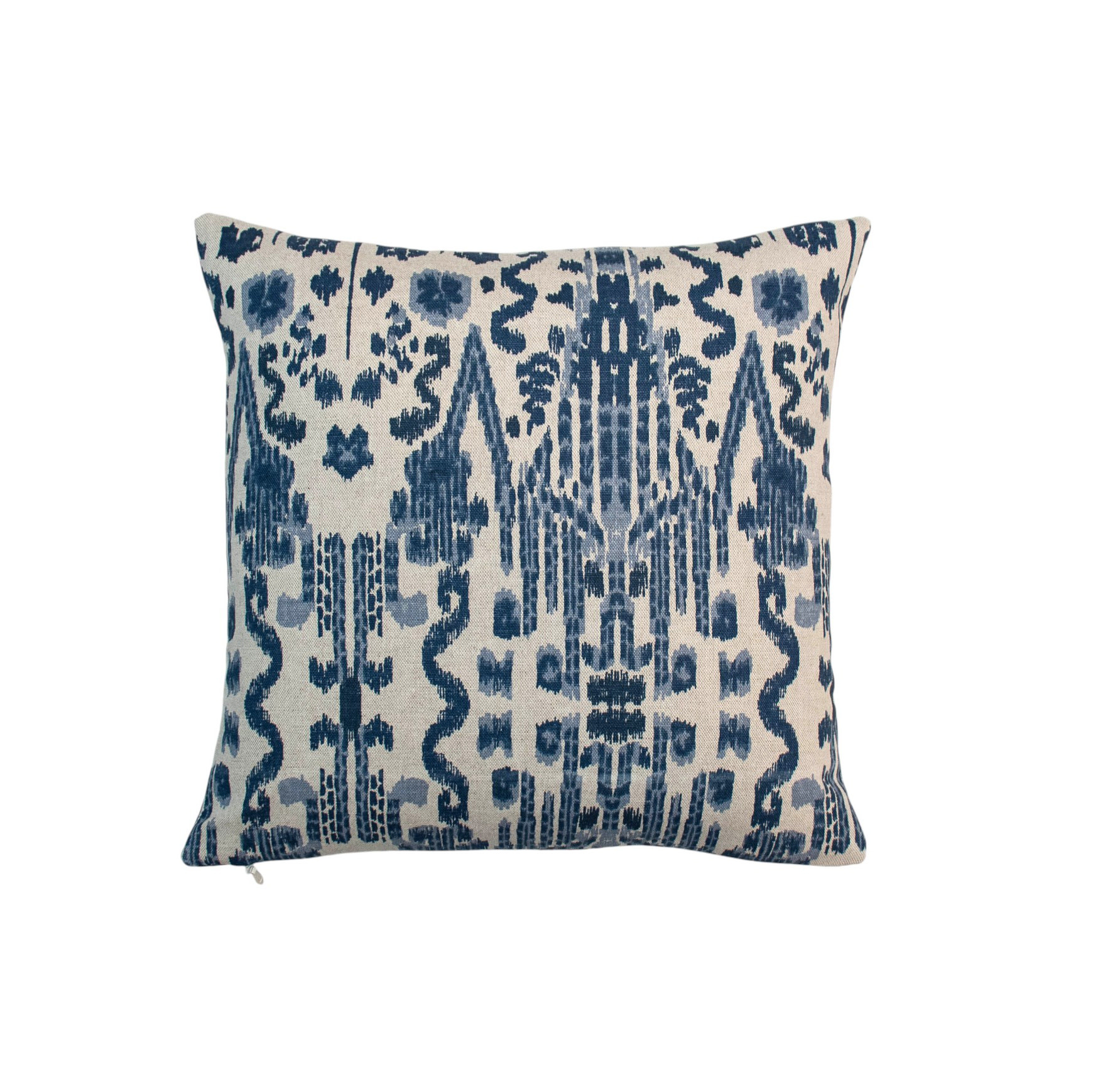 Bring global-inspired elegance to your space with this striking pillow crafted in Mumbai Indian Blue fabric from Kreatelier. Showcasing an intricate ikat-style pattern in rich shades of indigo and deep blue against a soft natural backdrop, this design adds depth, texture, and timeless character. The bold, symmetrical motif creates a refined statement while remaining versatile enough to complement both modern and traditional interiors. Perfect for layering on a sofa, accent chair, or bed, this pillow delivers a sophisticated pop of pattern with a relaxed, artisan feel.