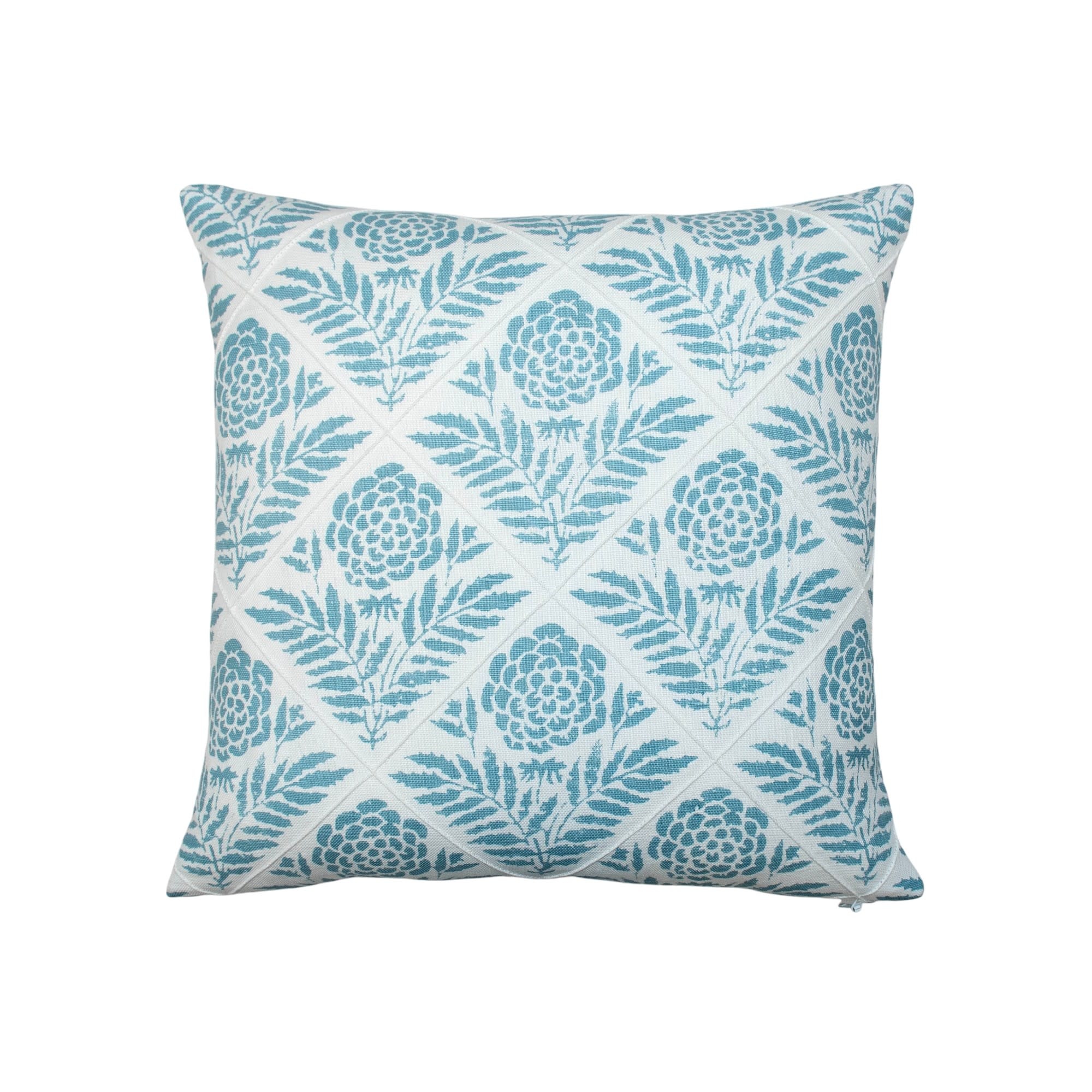 Fresh and airy, this pillow brings a soft pop of color to any space. A crisp white ground is printed with stylized florals in a soothing aqua blue, arranged in a chic diamond lattice pattern. Perfect for brightening a sofa, reading chair, or bed with a coastal, relaxed feel.