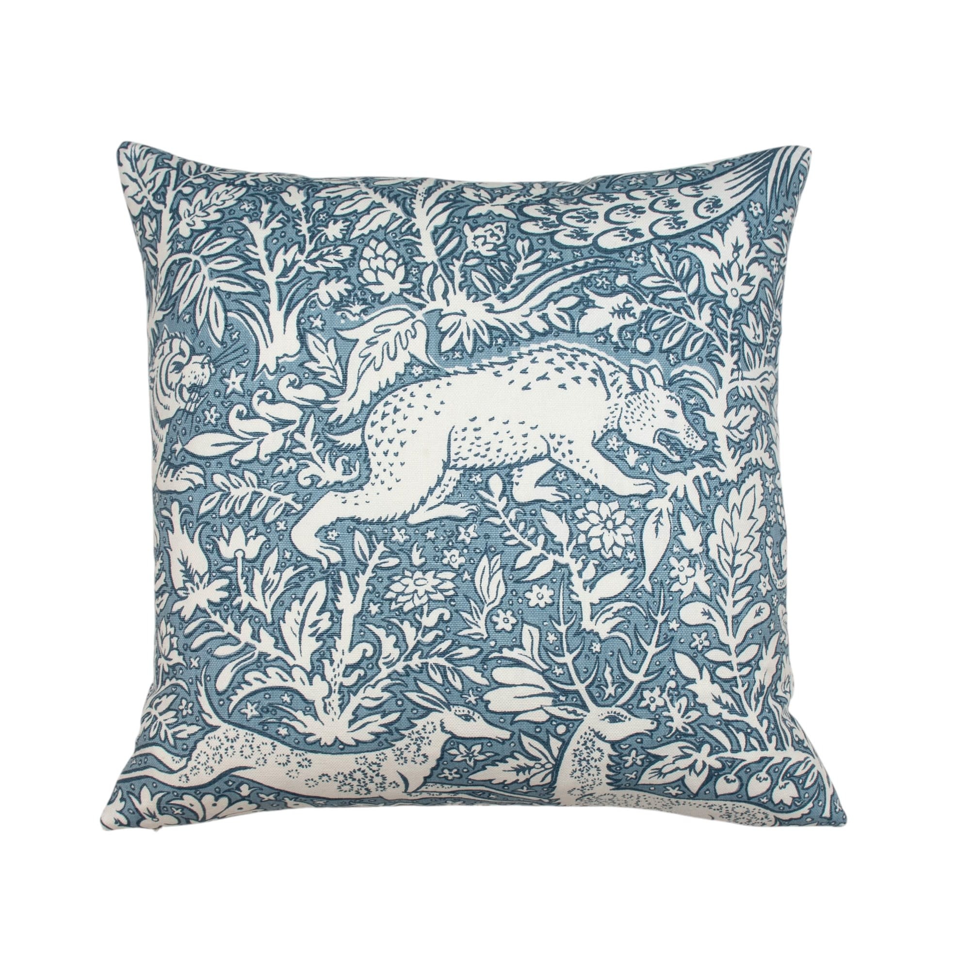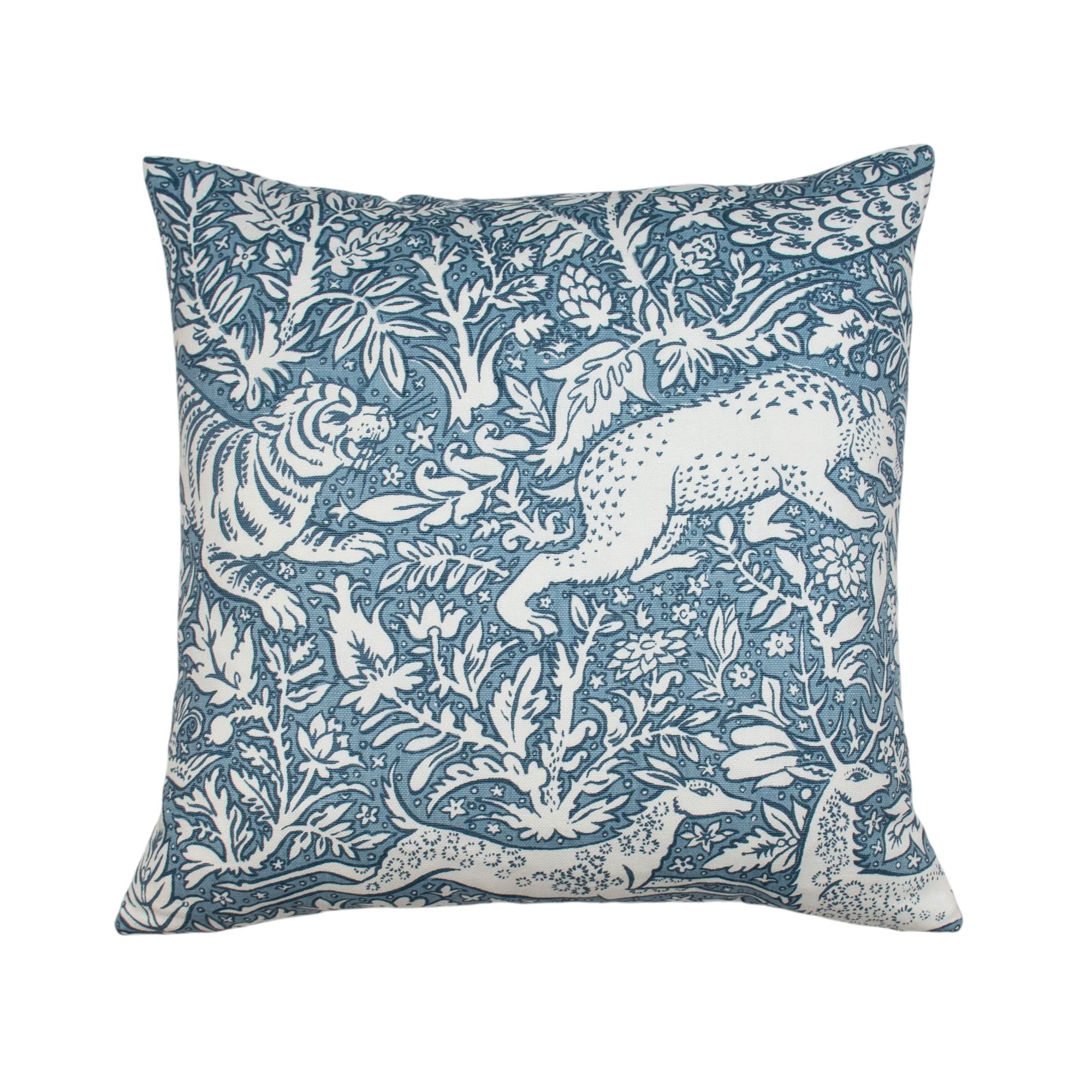 Timeless and intricately detailed, this pillow from Kreatelier features a classic woodland toile design in soft blue and ivory tones. The pattern showcases beautifully illustrated animals, birds, and lush botanical elements, creating a storybook-inspired scene full of charm and movement. The fine linework and balanced color palette give it a refined, elegant feel, while the textured fabric adds depth and softness. Perfect for both traditional and modern interiors, it pairs effortlessly with solids or layered prints.