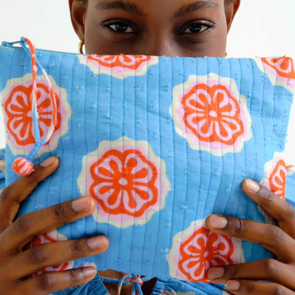 Bright, cheerful, and effortlessly stylish, this quilted pouch from Compania Fantastica features a vibrant red bloom print set against a fresh blue background. Designed with a soft, lightly padded texture and vertical quilting, it offers both charm and structure for everyday use. Perfect for organizing cosmetics, travel essentials, or small accessories, this pouch is finished with a secure zip closure and a matching wristlet pull for easy carrying on the go.