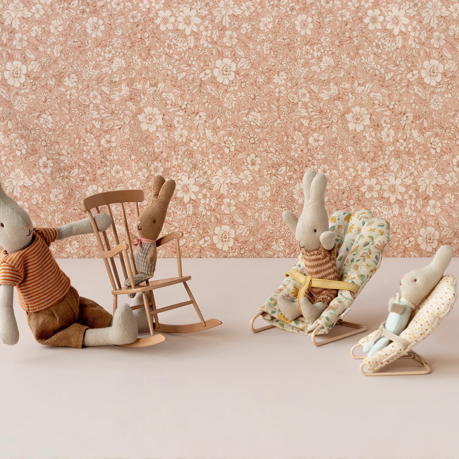 Meet the tiniest and most adorable member of the Maileg rabbit family. This sweet micro-sized bunny is crafted with soft linen fabric and delicate stitched details, giving it a timeless, handcrafted charm. Dressed in a classic patterned outfit with a gentle vintage feel, this little rabbit is perfect for tiny hands and imaginative play. Its compact size makes it easy to carry along on everyday adventures or to tuck into dollhouses and miniature worlds.