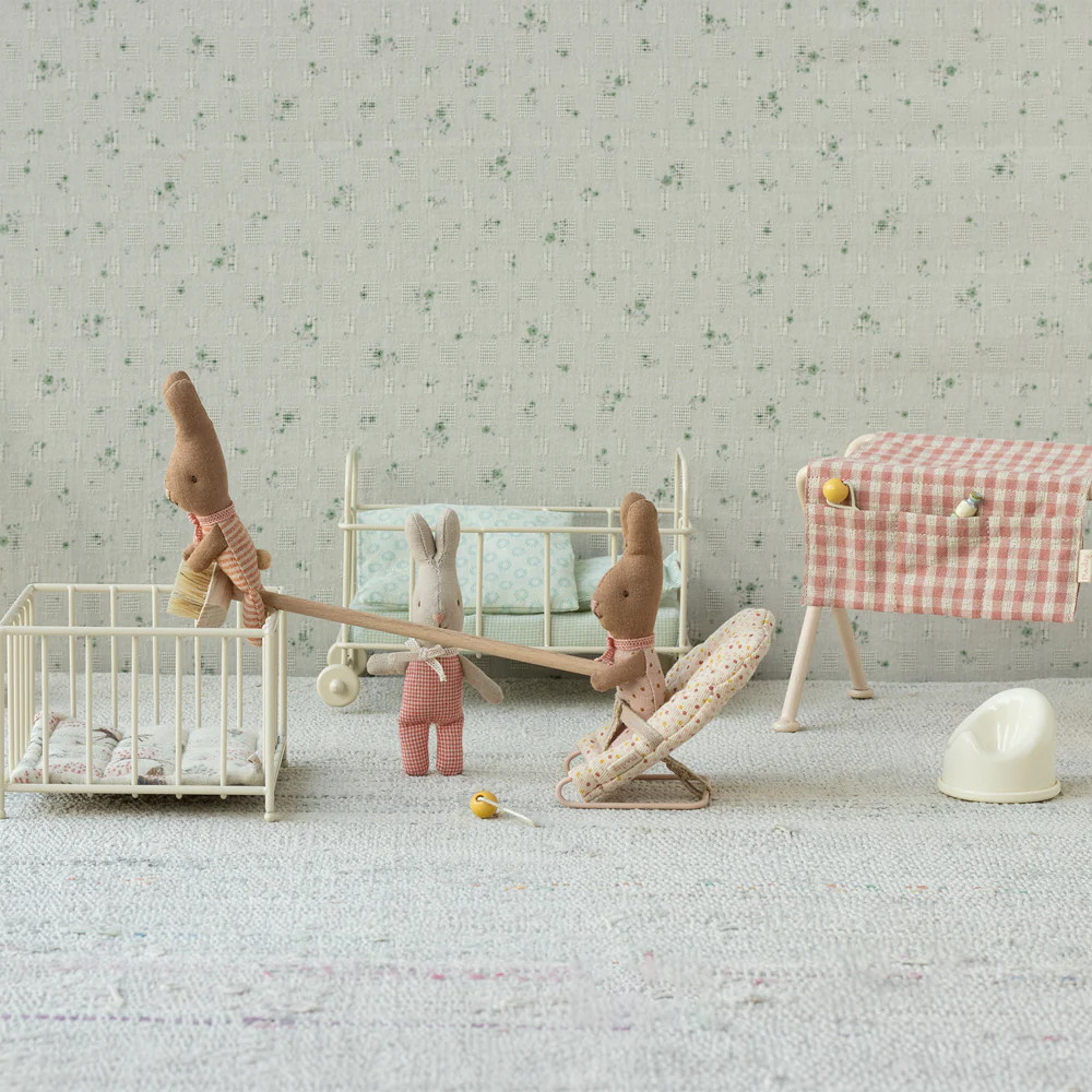 Meet the tiniest and most adorable member of the Maileg rabbit family. This sweet micro-sized bunny is crafted with soft linen fabric and delicate stitched details, giving it a timeless, handcrafted charm. Dressed in a classic patterned outfit with a gentle vintage feel, this little rabbit is perfect for tiny hands and imaginative play. Its compact size makes it easy to carry along on everyday adventures or to tuck into dollhouses and miniature worlds.