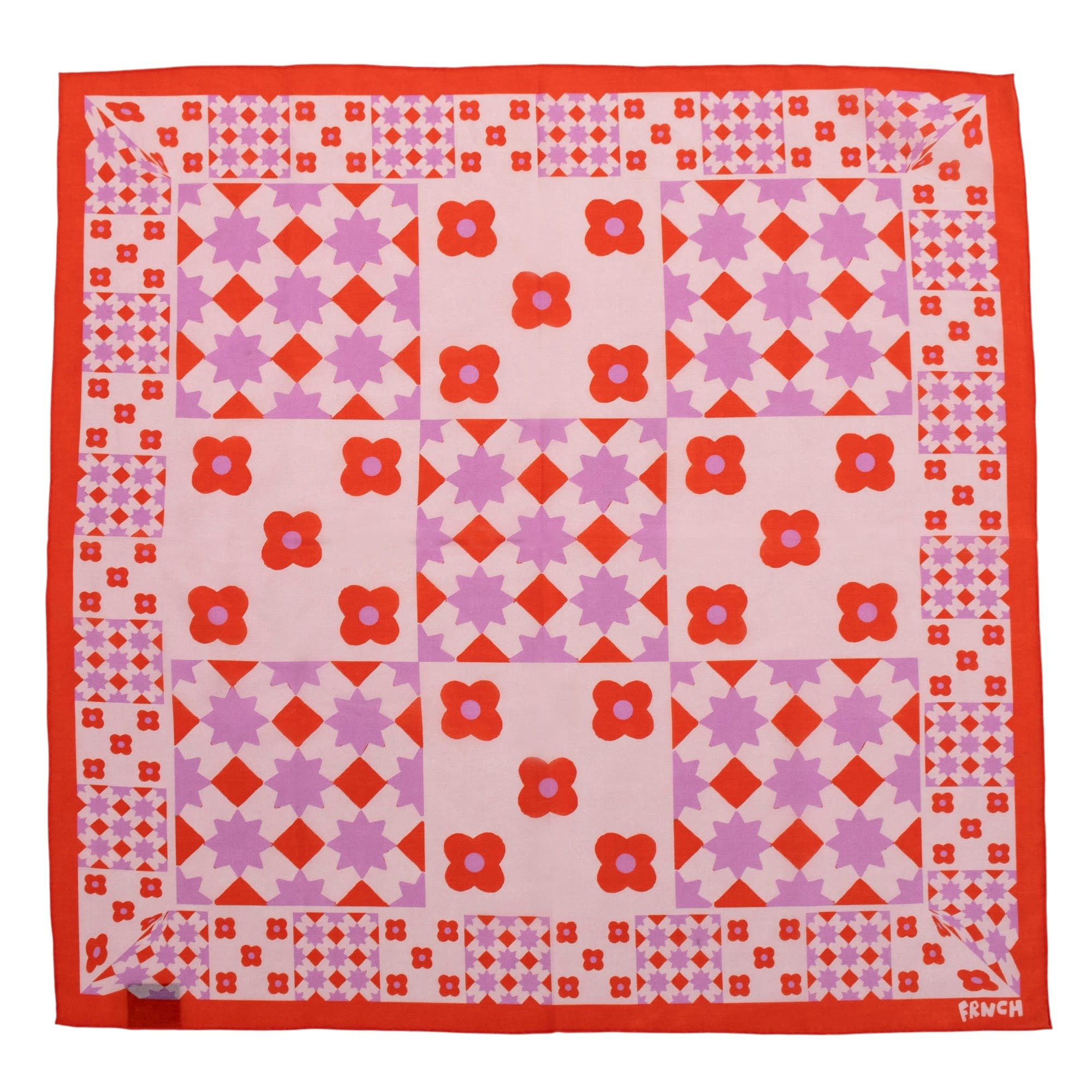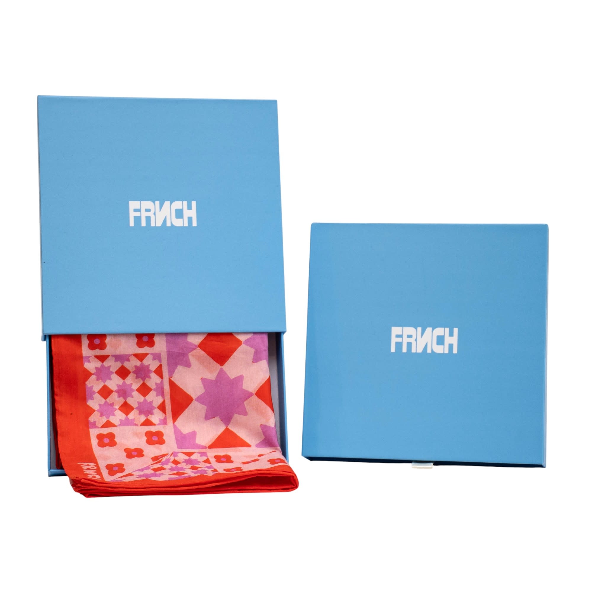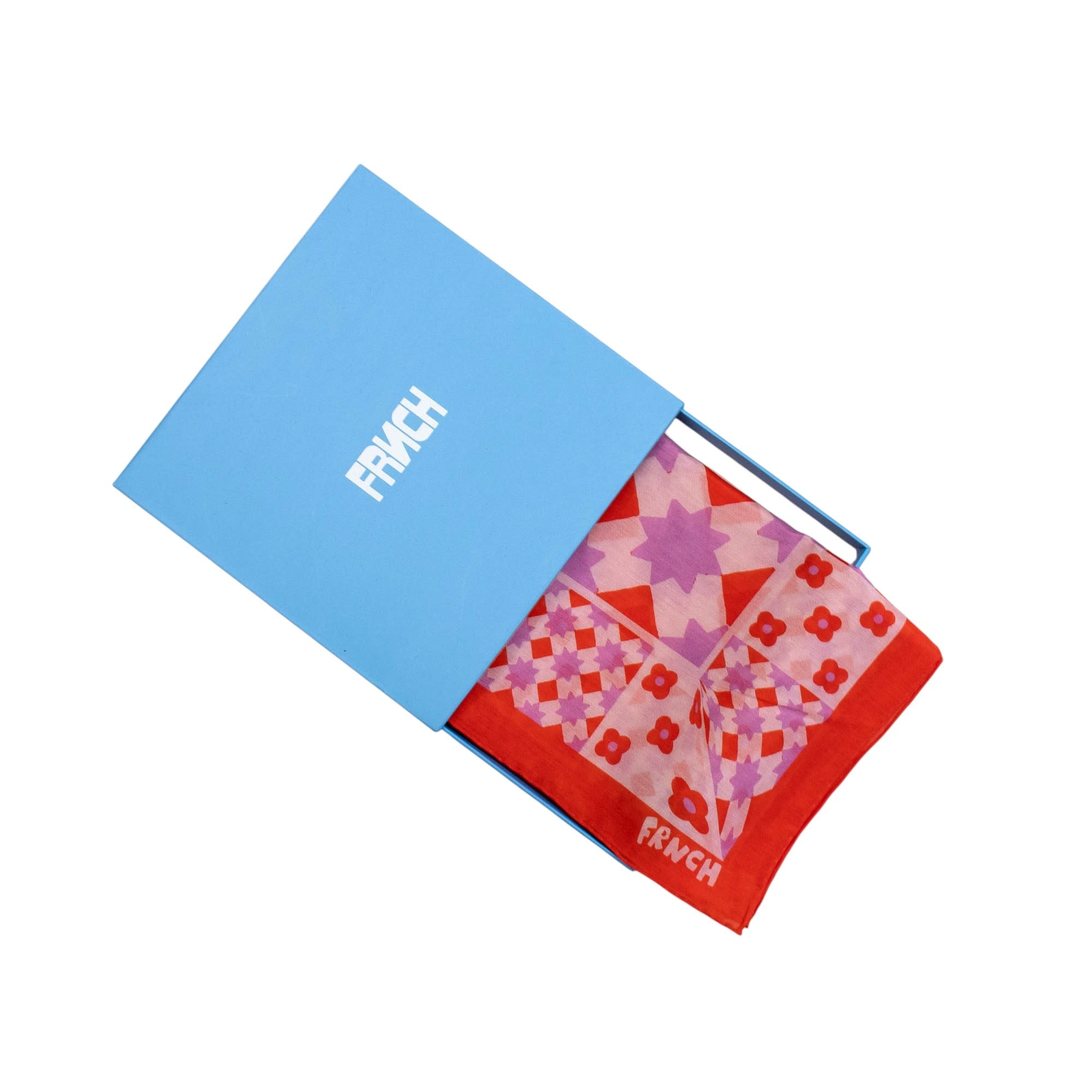 The Herisson Square Scarf from Frnch showcases a bold patchwork-inspired design with playful florals and geometric motifs in vibrant red, blush pink, and soft lavender. Framed with a rich red border, this eye-catching pattern feels both modern and timeless, adding instant personality to any look. This scarf is lightweight, breathable, and beautifully soft with a subtle sheen. Perfect to wear around the neck, draped over the shoulders, or tied to a bag, the Herisson scarf is a versatile accessory that elevates everyday outfits with color, artistry, and effortless charm.