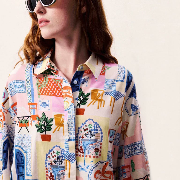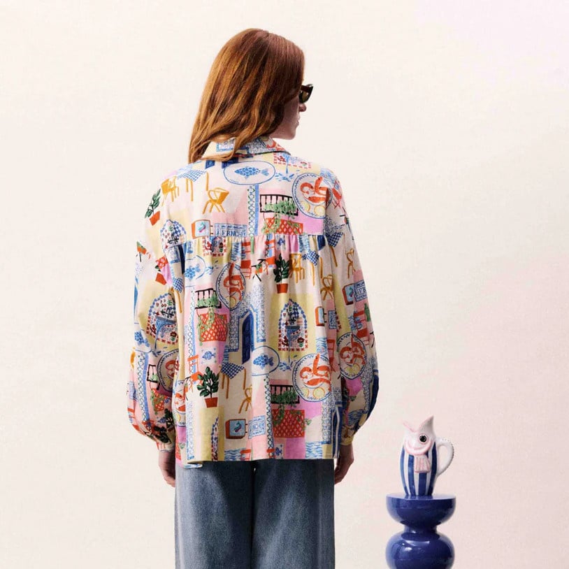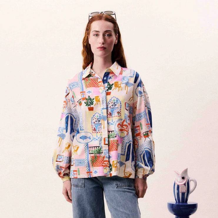 Vibrant and effortlessly artistic, the TOPAZE Shirt in Water’s Edge from Frnch brings a fresh Mediterranean spirit to everyday dressing. Crafted in a soft, lightweight fabric, this patchwork-style shirt features a playful mix of multi-colored prints inspired by seaside life—think sunlit terraces, ceramics, and coastal charm. Designed with a relaxed silhouette, it offers both comfort and statement style. The classic collar and button-down front are balanced by voluminous sleeves with gathered cuffs, creating a modern yet easygoing look.