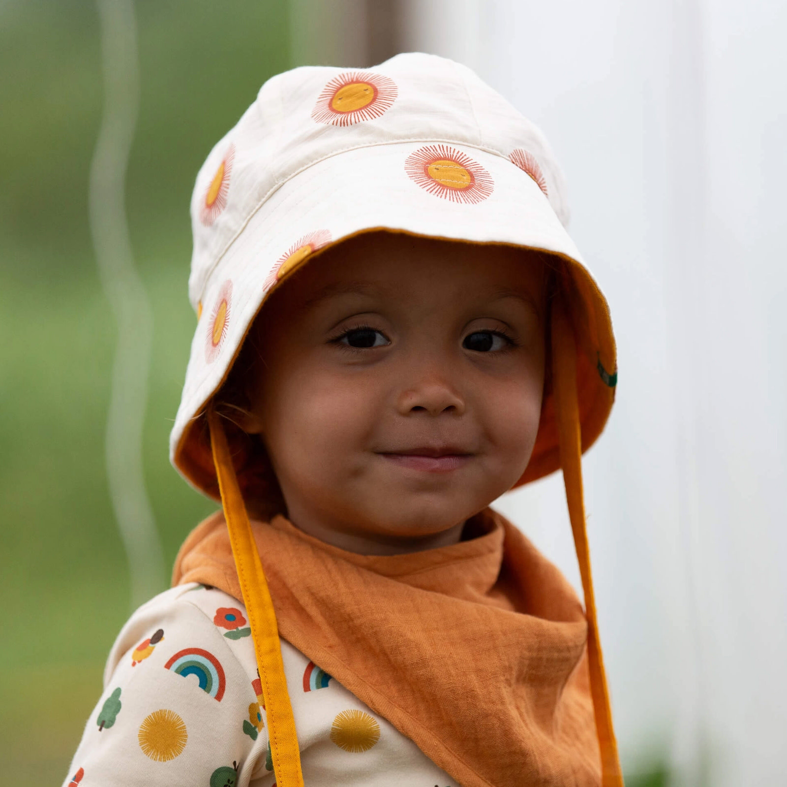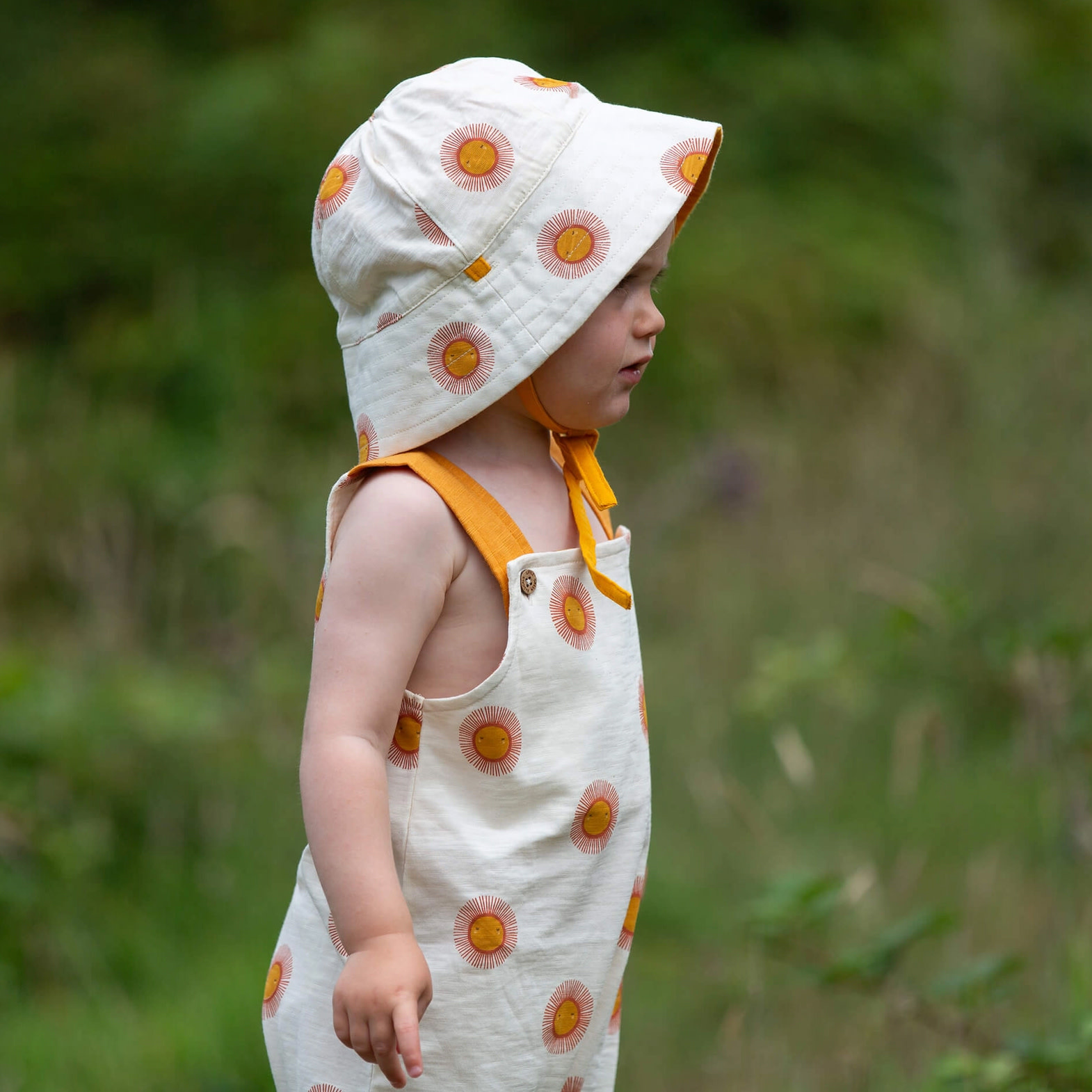 Brighten up sunny days with the Reversible Summer Sun Sunhat from Little Green Radicals, featuring a cheerful all-over sun print in warm golden tones on a soft cream background. Playful yet timeless, this design captures the joy of summer while adding a charming touch to any outfit. Crafted from lightweight, breathable fabric, it helps keep little ones cool and comfortable while providing gentle sun protection. The wide brim offers excellent shade, and the adjustable chin tie ensures a secure fit for active days outdoors.