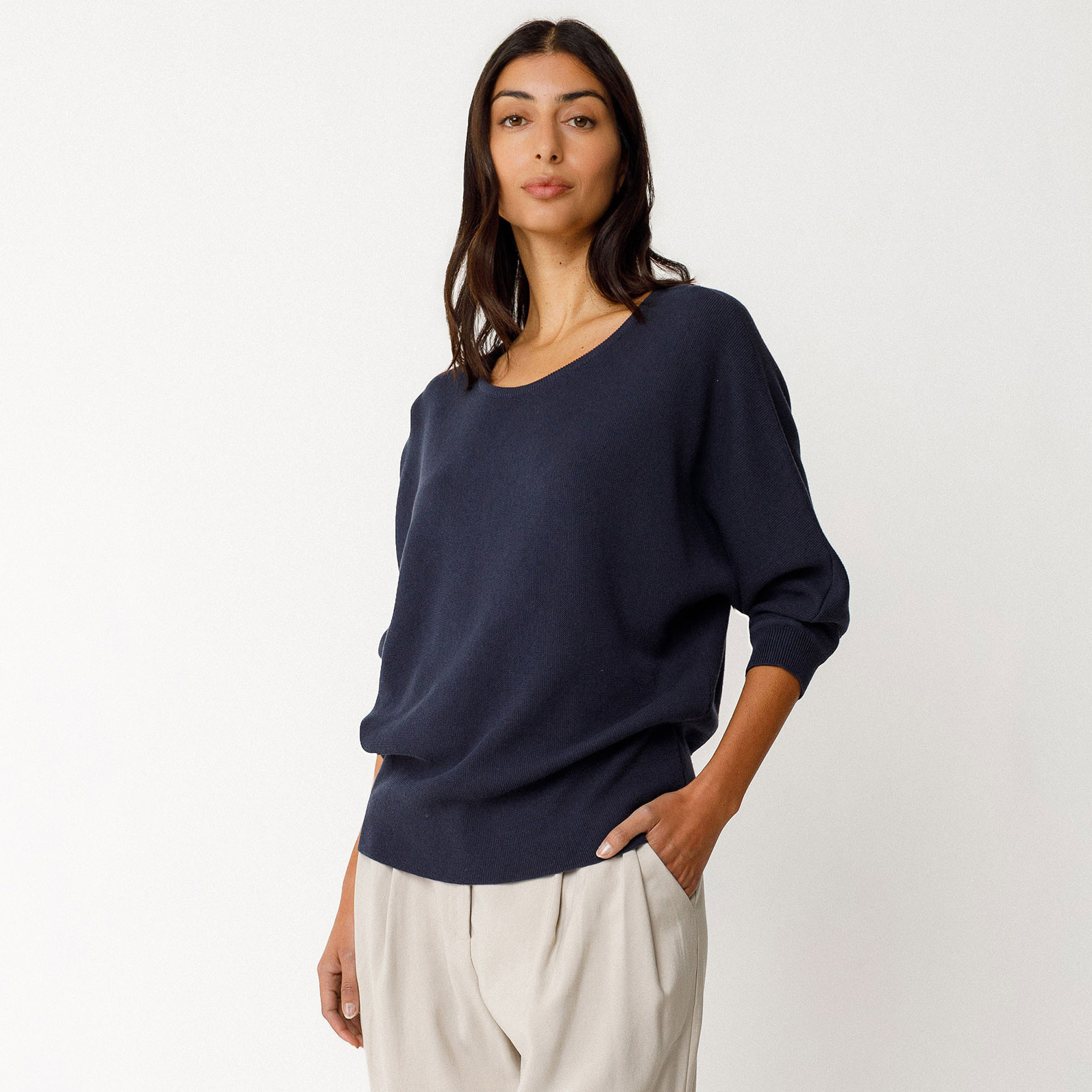 Effortlessly relaxed with a refined touch, the NAIKE-GOTS sweater from SKFK is crafted from medium-weight GOTS-certified organic cotton for a soft, breathable feel. Designed in a textured garter stitch, it features a classic round neckline and loose batwing sleeves that create a comfortable, easy silhouette. Finished with ribbed cuffs for subtle structure, this versatile navy piece is perfect for everyday wear—pair it with tailored trousers or denim for a clean, modern look.