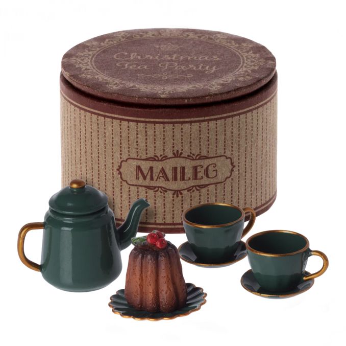 Maileg Tea Party Christmas couldn't be a better way to play tea for two! It is a set of 2 forest green cups and saucers, 1 tea pot, 1 cake plate AND cake! Maileg tea party Christmas is a cheerful way to play while waiting for Santa!