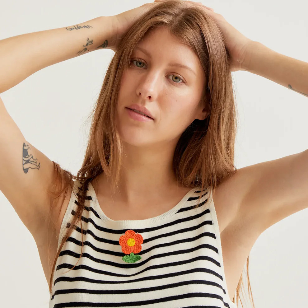 A timeless classic with a playful twist, this black and white striped top from Compania Fantastica is crafted from soft, comfortable knit fabric for an easy everyday fit. Designed with a clean round neckline and sleeveless silhouette, it offers a fresh and versatile look perfect for layering or wearing on its own. A delicate embroidered flower detail at the chest adds a charming pop of color, while ribbed trim enhances structure and finish. Effortlessly chic, this piece pairs beautifully with denim, tailored pants, or skirts for a polished yet relaxed style.