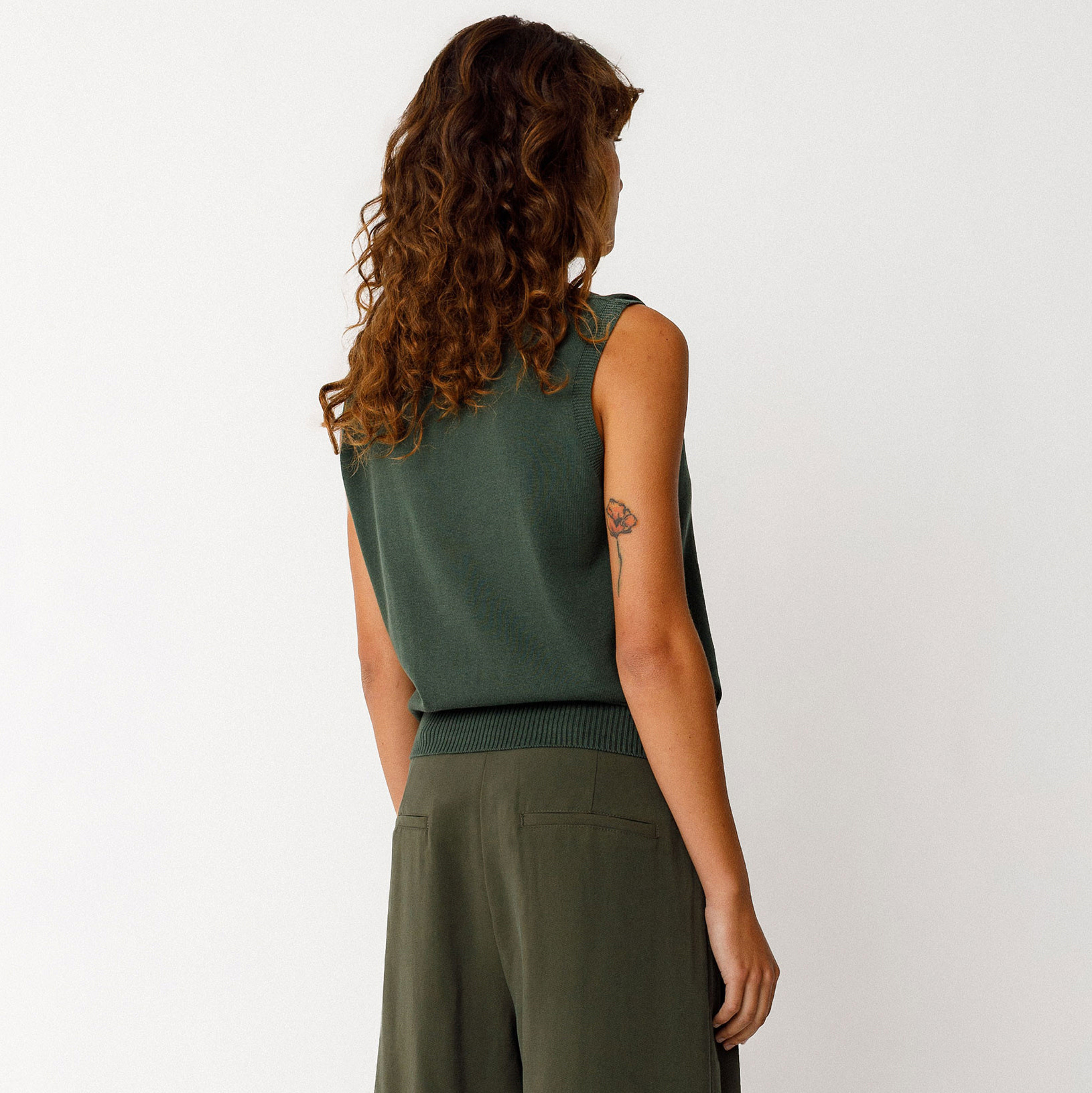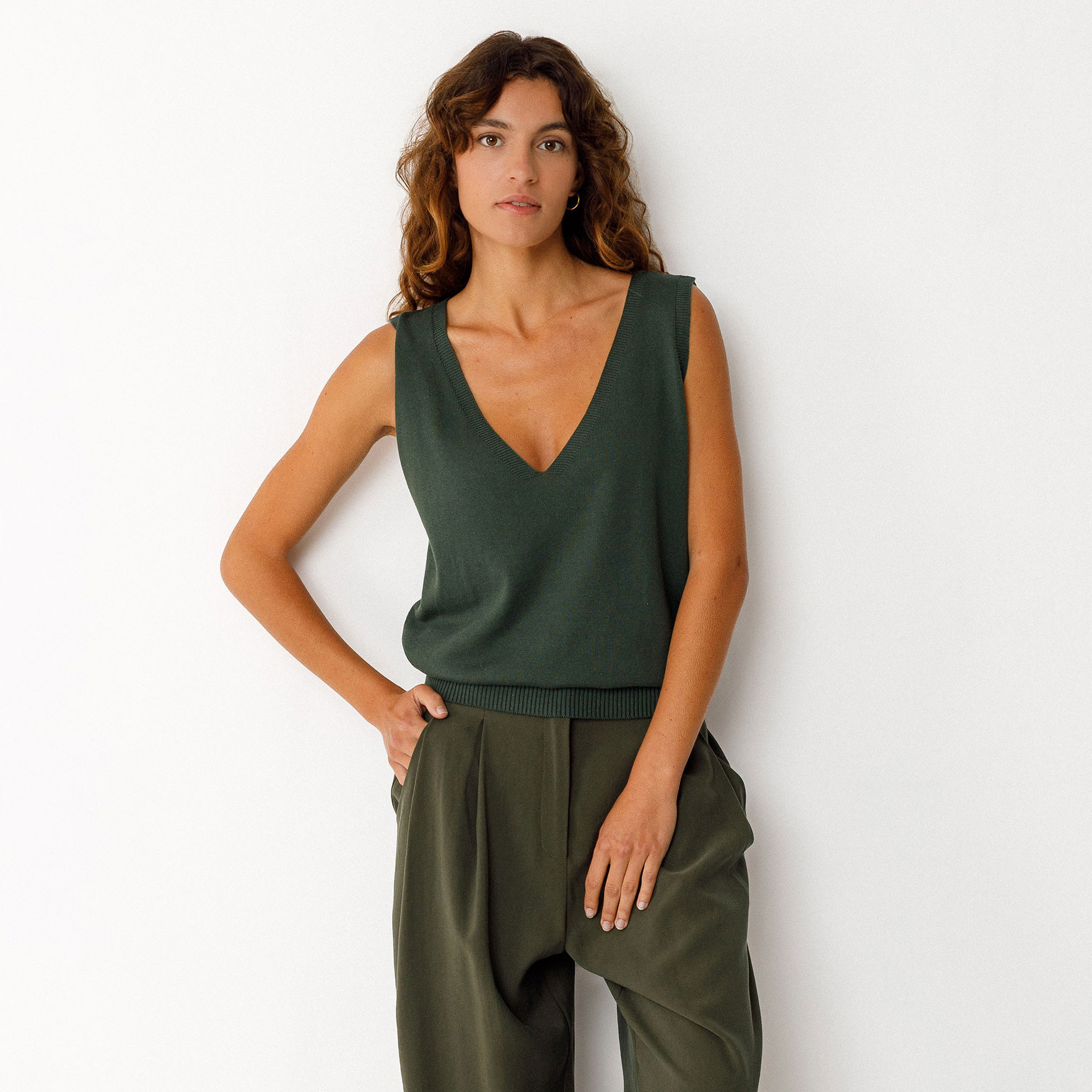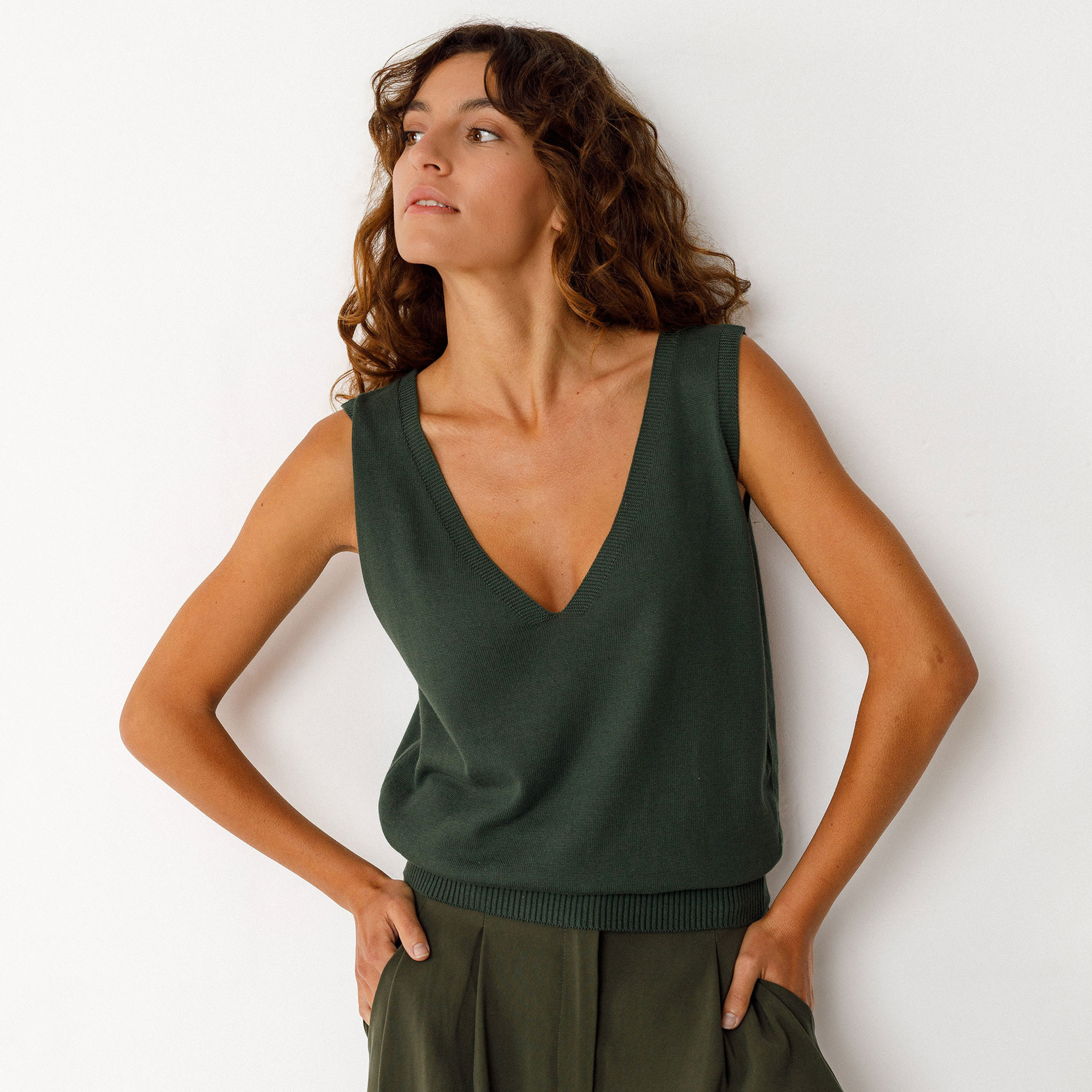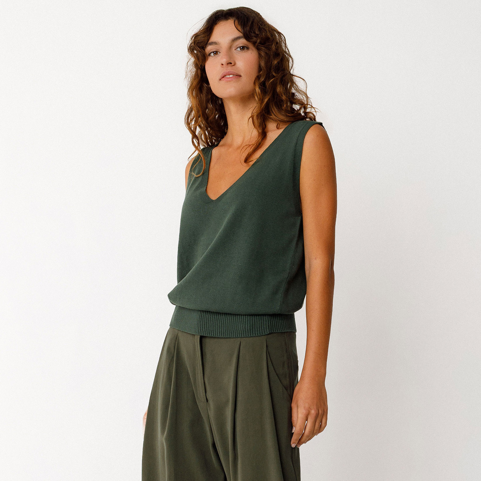 This sleeveless V-neck top from SKFK is a timeless essential designed for effortless everyday wear. Made from lightweight, GOTS-certified organic cotton knit, it feels soft, breathable, and gentle on the skin. The clean V-neckline creates a flattering silhouette, while the standard length offers easy styling versatility. Finished with ribbed trim at the bottom hem, this piece adds subtle structure to its relaxed fit. Perfect worn on its own in warmer weather or layered under jackets and cardigans year-round.