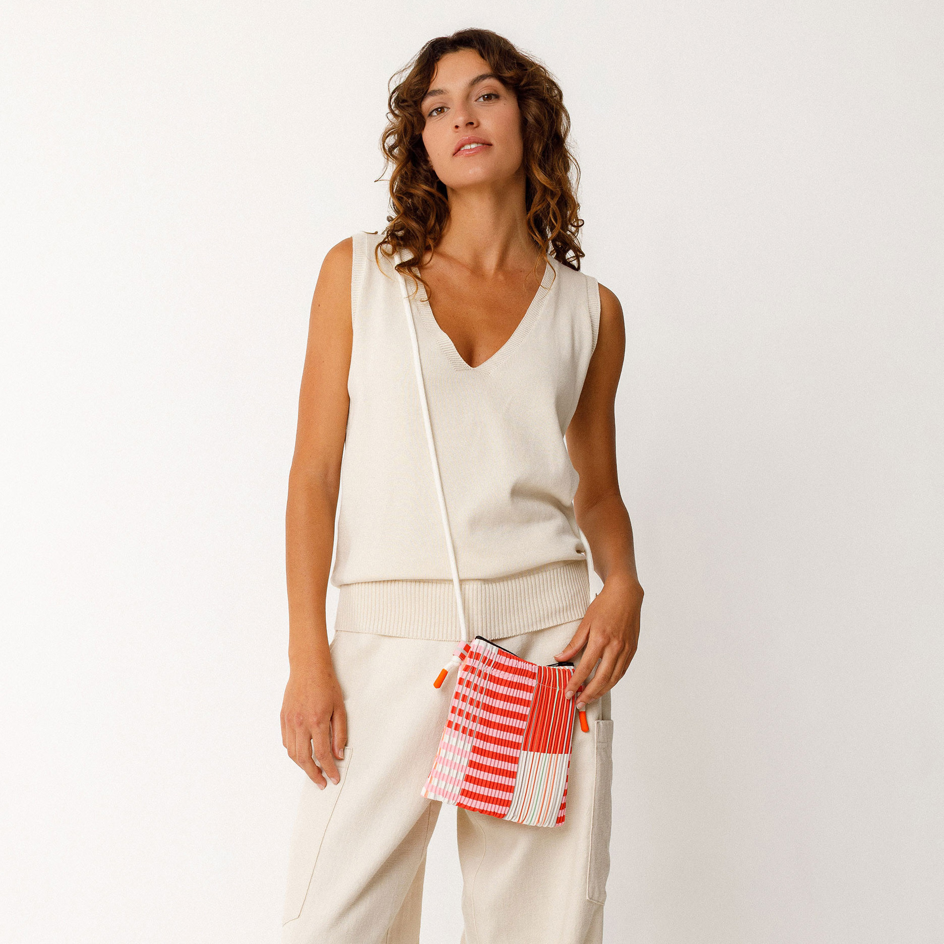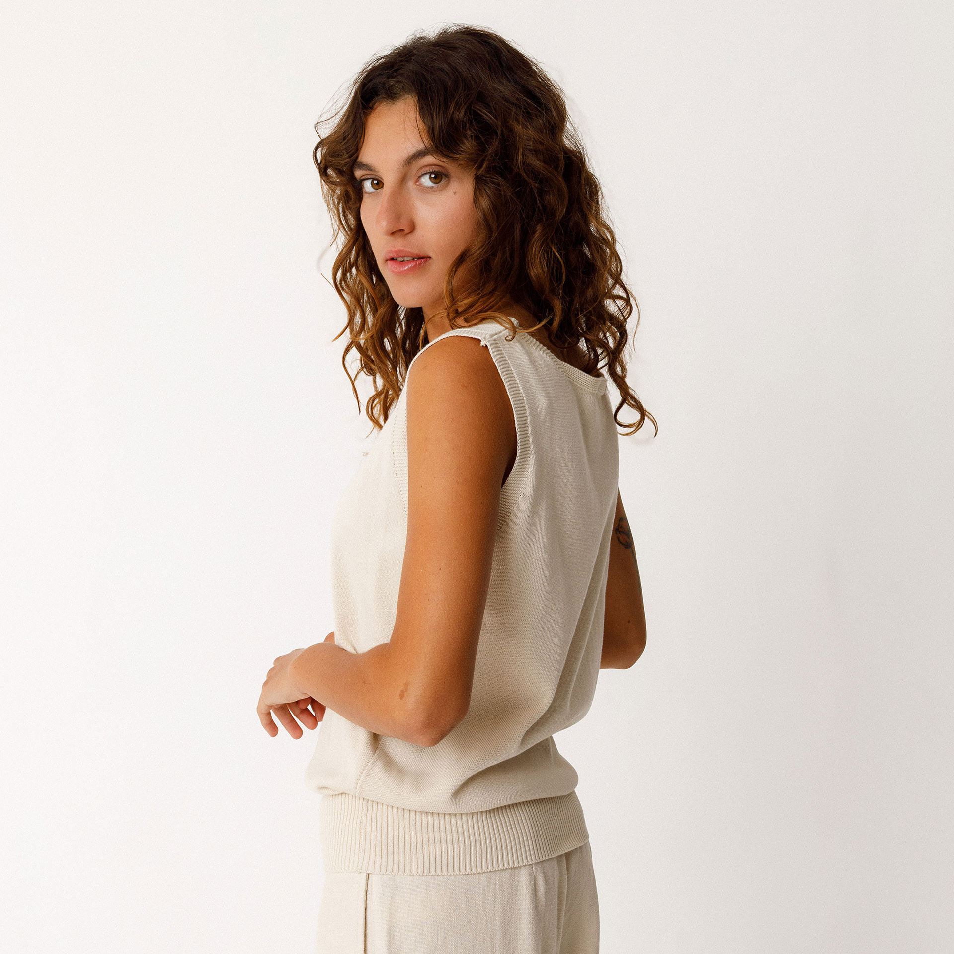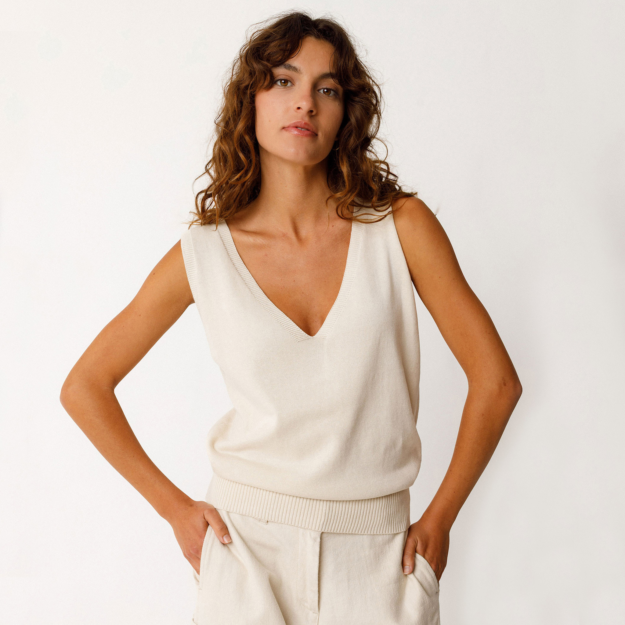 This sleeveless V-neck top from SKFK is a timeless essential designed for effortless everyday wear. Made from lightweight, GOTS-certified organic cotton knit, it feels soft, breathable, and gentle on the skin. The clean V-neckline creates a flattering silhouette, while the standard length offers easy styling versatility. Finished with ribbed trim at the bottom hem, this piece adds subtle structure to its relaxed fit. Perfect worn on its own in warmer weather or layered under jackets and cardigans year-round.